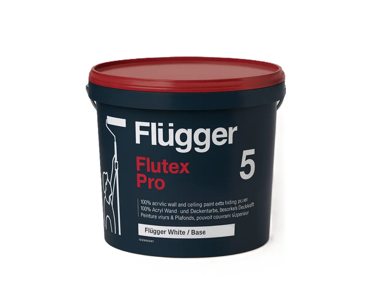 Flügger Flutex 5 is a high-quality acrylic paint for interiors, which can also be used on exterior mineral surfaces (gypsum, cement, lime plaster, etc.). The paint creates a smooth, uniform coating with high hiding power and outstanding resistance to moisture. The product is distinguished by its high resistance to wet cleaning, which allows the surface to be cleaned frequently without losing color. It can be tinted in any color.