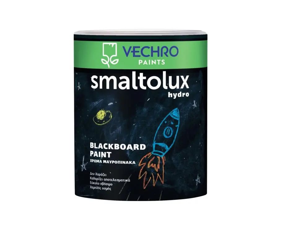 Vechro Smaltolux Blackboard is a new generation water-based matt acrylic paint with a velveteen finish. Converts various surfaces into a functional chalkboard. Excellent resistance to chalk scratches, easy to clean, easy to wipe off writing. Low VOC content.
