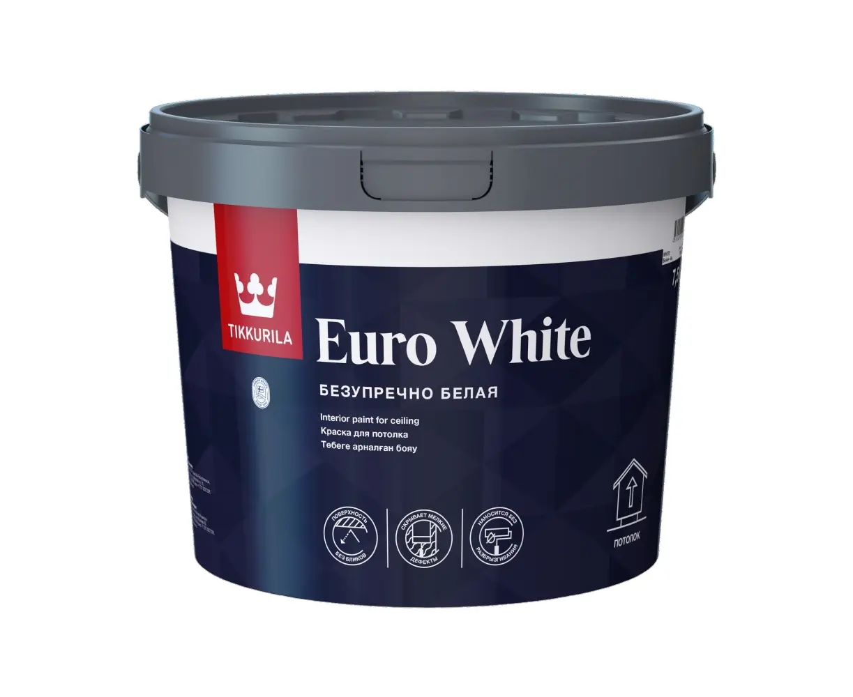 Tikkurila Euro White paint will allow you to create the ceiling of your dreams! It is developed using the most modern technologies, which allows you to reduce the absorption of sunlight and ensure long-lasting brightness and whiteness of the ceiling. Unique microspheres in the formula effectively diffuse light, giving the painted ceiling a flawless look with a perfect matte surface. The paint also has excellent hiding power and low side sheen. These qualities allow it to perfectly conceal minor surface defects. This paint has a neutral odor. It is safe for health and complies with European environmental standards for the content of volatile organic compounds, and can be used in children's institutions and premises of the administrative group of medical and preventive institutions.