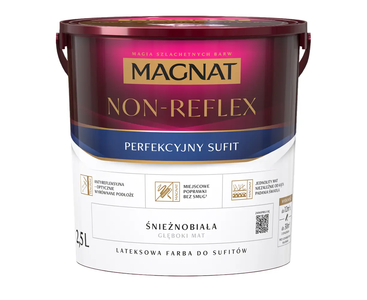 MAGNAT NON REFLEX, white, deep-matt ceiling paint. Its special formula allows for touching up imperfections without streaks. The coating absorbs light reflections, ensuring an optically uniform finish. Resistance to washing, scrubbing, and UV/UVC ensures longer-lasting color and that 'just painted' effect. The snow-white color looks excellent on walls and ceilings in open-plan spaces. Matte white deeply absorbs light reflecting off the surface, while optically leveling the substrate. This versatile color is often chosen for painting ceilings. In smaller rooms with limited access to natural light, the snow-white shade makes the interior appear larger and brighter. This color looks great under both natural and artificial lighting. It works best in rooms with East, West, or South exposure. The paint also delivers lower dust adhesion and resistance to mold and fungus, improving the quality and comfort of life for the entire family.