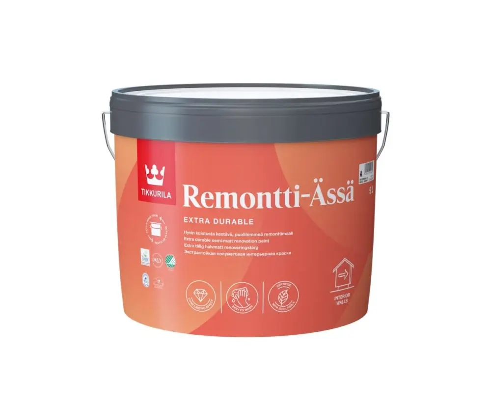 Tikkurila Remontti-Ässä C 9 l is a semi-matte, water-based paint intended for interior use — especially for wet spaces such as bathrooms and kitchens.