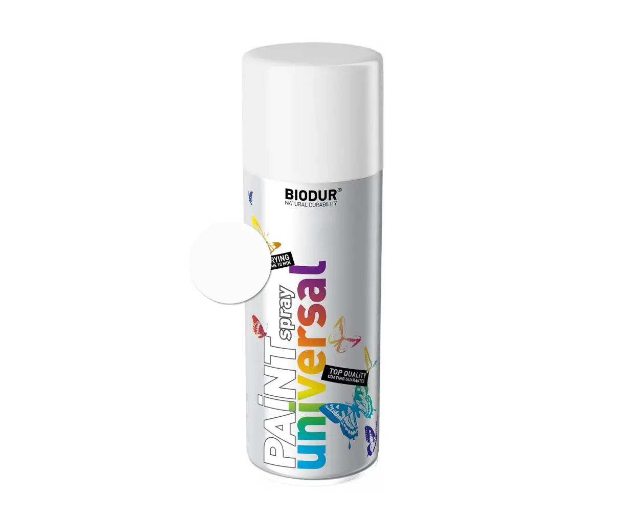 Spray paint Biodur is a fast drying alkyd enamel that is used for painting metal, concrete, plaster, wood, glass, paper and other surfaces. Designed for external and internal painting. Creates a durable coating that is resistant to mechanical and weather conditions.
