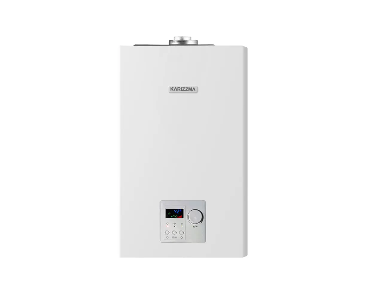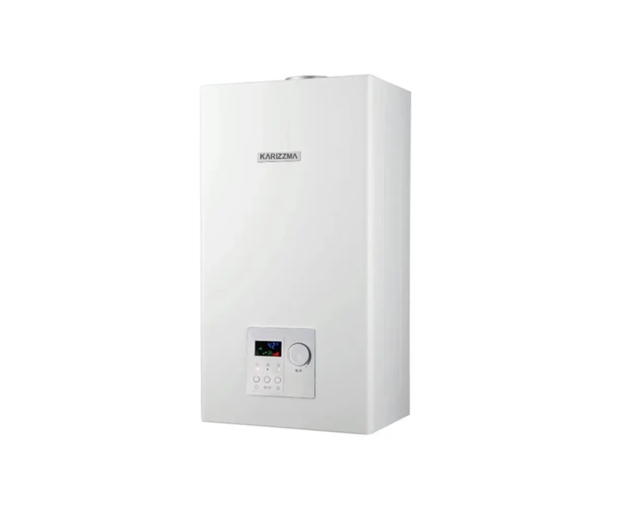 Gas boiler KARIZZMA 24 kW with coaxial pipe ensures efficient heating with a hermetic combustion chamber. Provides 12.5–13 l/min hot water flow at △ 25°C, operates on natural gas, and features an LCD display. White design.