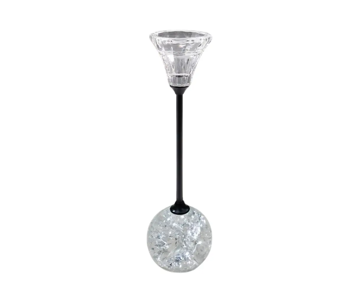 This elegant candle holder features a transparent glass design with a tall and slender shape. The upper part is specially crafted to securely hold the candle, while the base is decorated with a crystal effect that adds a unique brilliance. Perfect both for everyday décor and for creating a festive atmosphere.