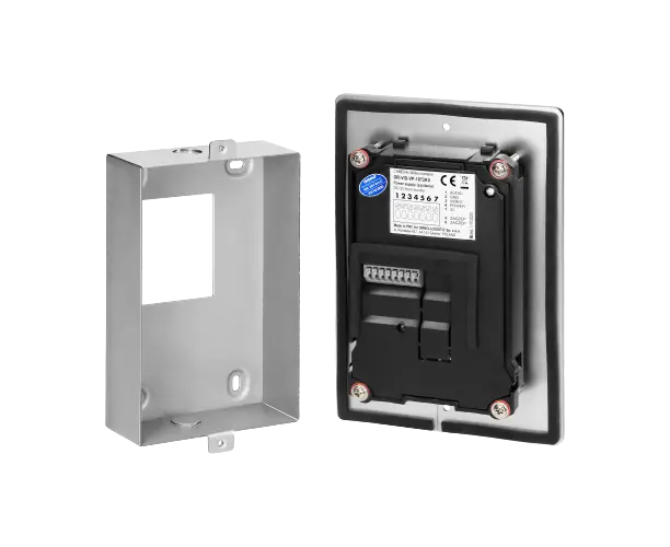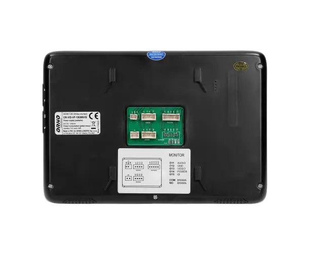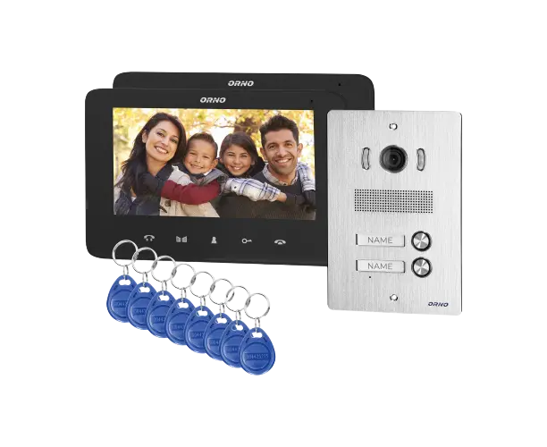 Video-doorphone set includes multicolour, ultra-flat 7" LCD monitor with a touch panel and backlit buttons. Monitor parameters (brightness and colour, speech and ringtone volume) can be adjusted. There are 16 ringtones to choose from and a CMOS camera. This device is suitable for flush-mounting, has got a protective roof, name plate and bright LED diodes that provide excellent night vision. The lock can be released with the use of a proximity tag. Additionally, the set can support gate opening and, if you connect an additional monitor to it, you can activate intercom function. DC power source from power supply unit to power outlet (15V DC) or optionally from DIN rail power supply (OR-VID-VP-1009ZD). Electric strike suitable for 12V DC and power consumption of max. 300mA does not require additional power supply.