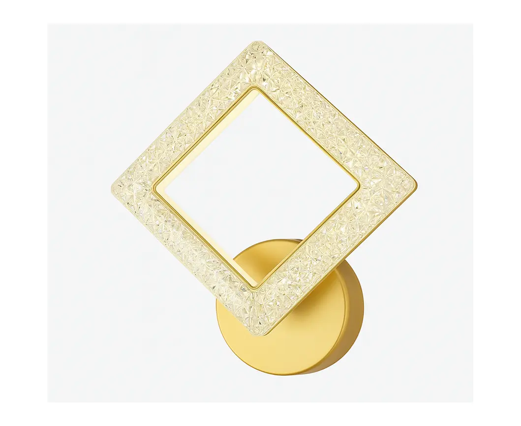 This modern and sophisticated wall light features a square LED element covered in crystal-textured clear acrylic. The gold-tone wall fixture and frame add to the luxurious look, while the lighting creates a warm and cozy atmosphere. Ideal for both home and hotel interiors.