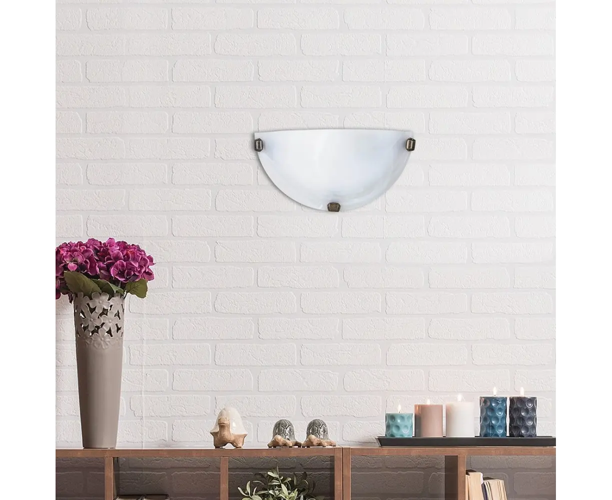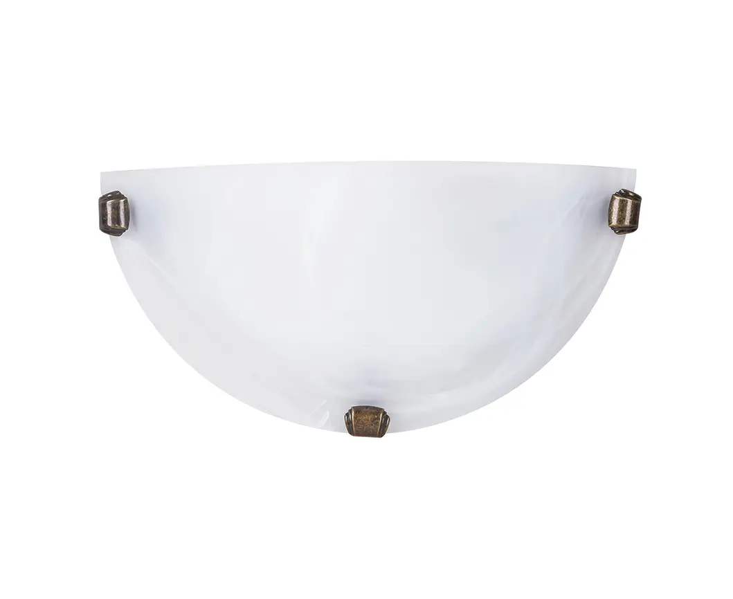 Traditional style wall light with a 30 cm wide metal and plastic construction, a high-quality, thick white alabaster glass shade and brass-colored fittings. It can be used with halogen or LED light sources, as well as up to 60 W, with an E27 socket.