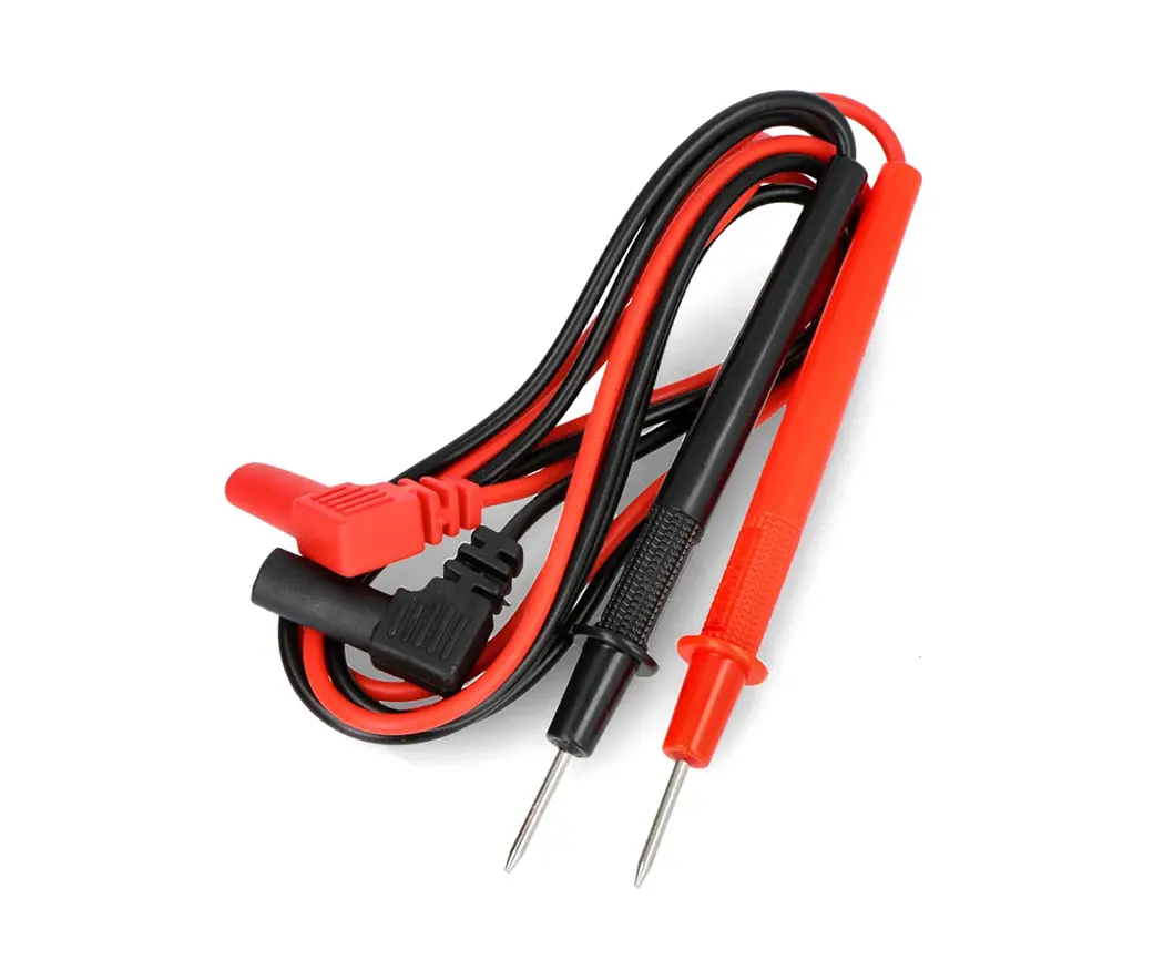 The universal connectors of the meter ended on one side with angled banana plugs, and on the other with measuring probes. Designed for most meters with classic plugs. The high quality of the cables guarantees the accuracy of measurements and user safety. The maximum amperage is 2A, and the voltage is 1000V. The kit includes two test leads, which are tightly sealed in foil packaging. The length of one cable is 80 cm.