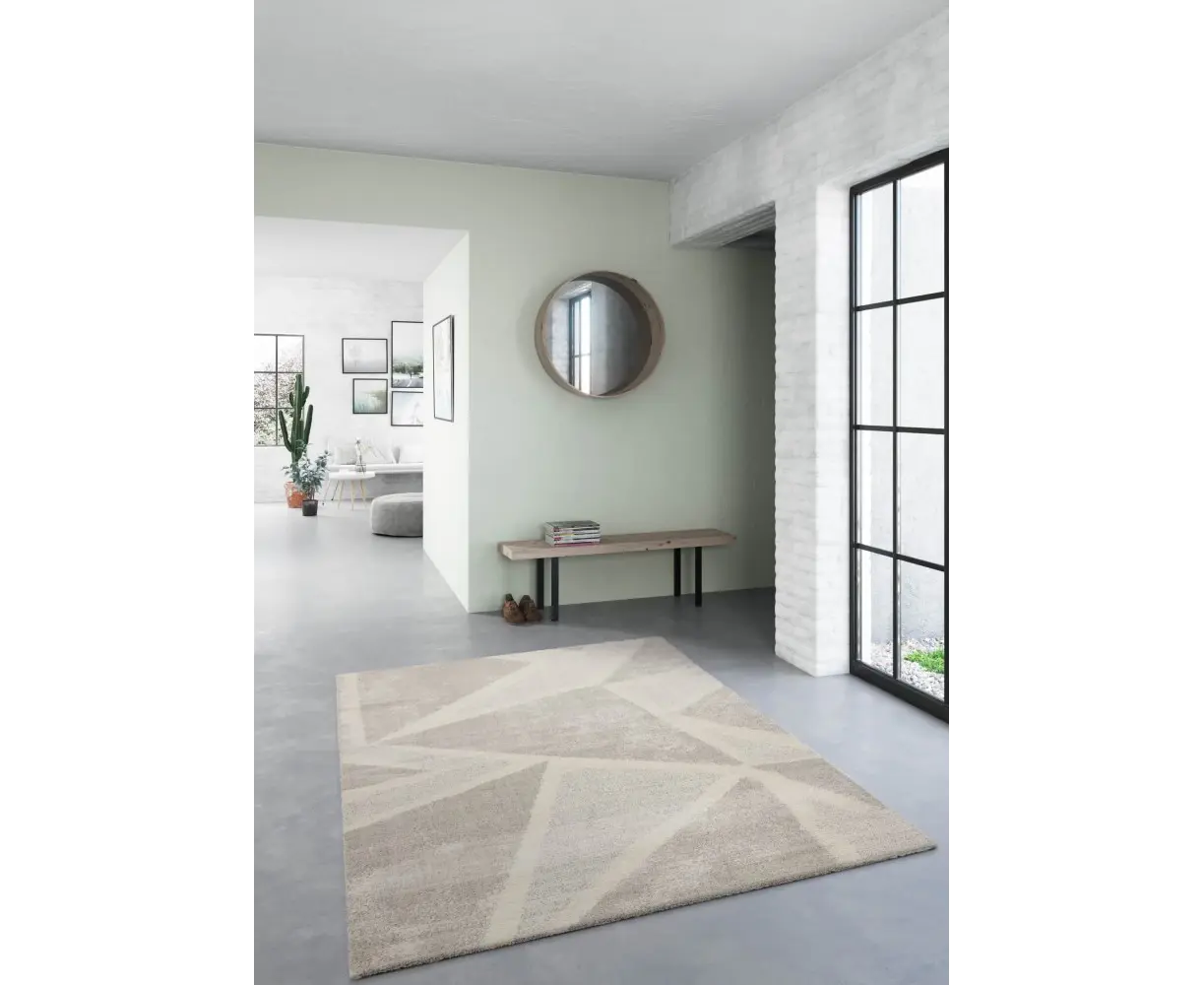 This rug model combines durable polypropylene with soft polyester, creating a dense and pleasantly textured pile. Thanks to the blend of fine microfibers, the surface has a subtle shimmering effect light gently reflects off the smooth yarns, producing a delicate glow. The Siroc collection is inspired by natural tones from warm sandy and earthy shades to cooler hues reminiscent of coastal cliffs, sea breeze, and landscapes shaped by the warm Sirocco wind. Refined geometric patterns easily complement both modern and classic interiors. The tightly woven 14 mm pile with a weight of 1.50 kg/m² ensures exceptional comfort underfoot and durability in everyday use. The materials do not accumulate static electricity, do not shed, and are easy to clean, keeping the rug looking fresh for a long time. The rug features a handmade look, produced using the Woven Cosy technique with a decorative shaggy finish, suitable for underfloor heating and certified according to the Oeko-Tex® standard, ensuring safety and quality.