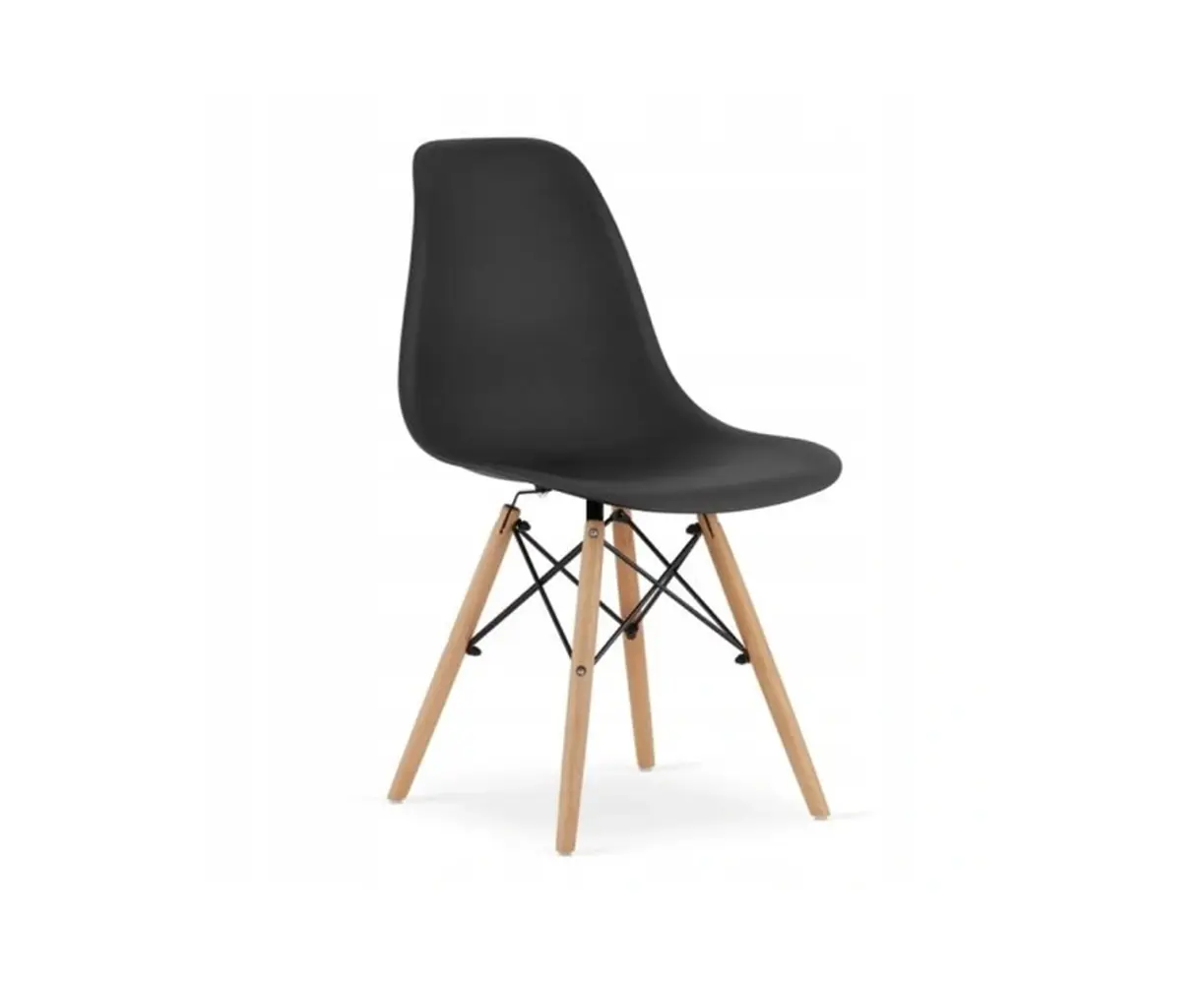 The black chair with plastic seat and wooden, metal legs combines practicality, durability and modern design aesthetics, making it a versatile and elegant choice in a variety of settings.