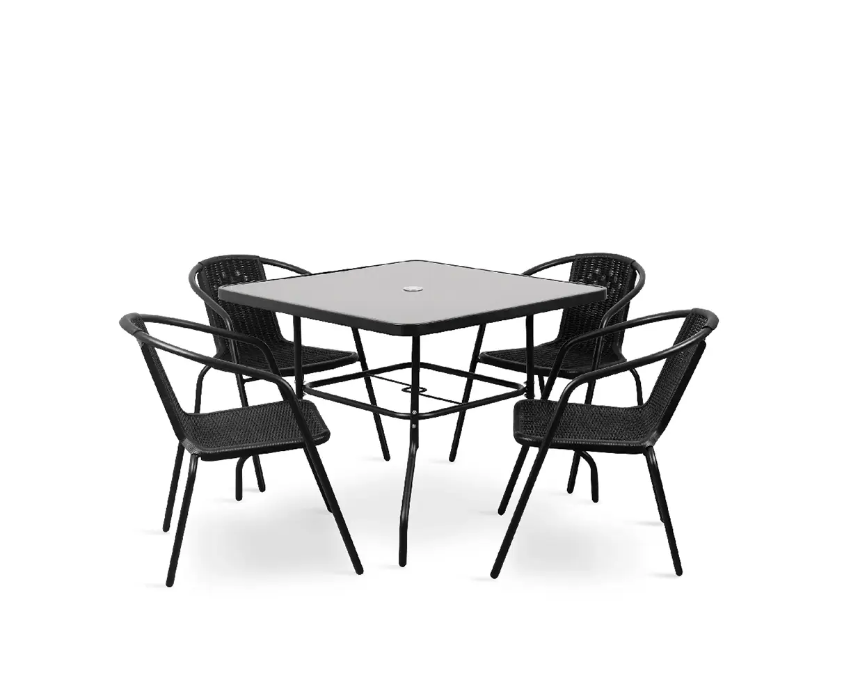 The frame of the chairs and table is made of durable metal with a black powder coating, which guarantees durability and resistance to any weather conditions. And the artificial rattan weave on the seats and backs of the chairs is not only beautiful but also incredibly comfortable! The glass tabletop adds special elegance and visual lightness to the set. This set is a real find for those who love to spend time outdoors. The garden furniture set ideal for a terrace, garden, or balcony, turning them into a cozy corner for relaxation and socializing. Artificial rattan weaving is not afraid of moisture or sunlight, and the glass tabletop is easy to clean. The compact size of the set allows you to place it even in a small space.