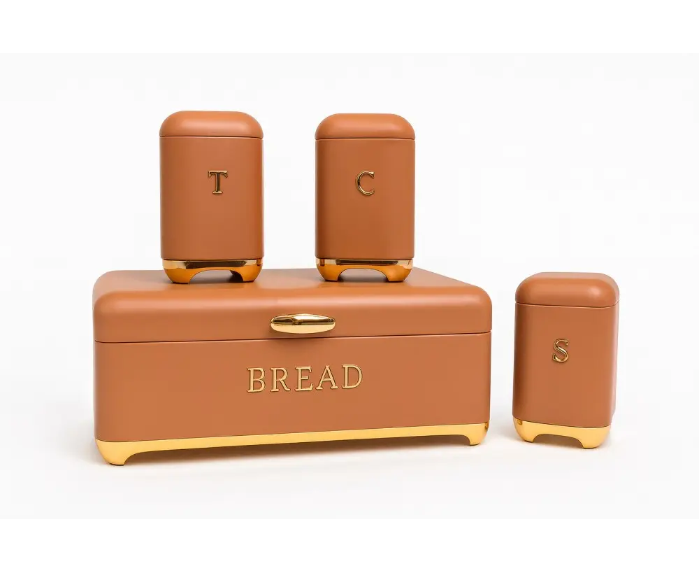 This elegant kitchen set combines style and functionality. The bread box and containers with golden details bring a modern touch to any interior. Perfect for storing bread, tea, coffee, sugar, and spices. Made from high-quality material, it ensures durability and practicality, making it indispensable for everyday use.