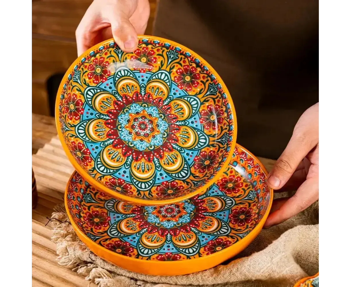 This beautiful plate, featuring a distinctive and original design with a vibrant color palette, is made of high-quality ceramic. It has a glossy surface that is easy to clean and maintains its original appearance. Ideal for both everyday use and for decorating the table on special occasions.