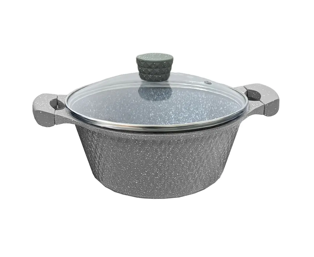 It has a textured exterior and two sturdy handles on either side. It comes with a clear glass lid with a gray, textured handle. It has a slightly flared shape and two wide, integrated handles for easy handling. The clear glass lid allows you to monitor the progress of your dish without lifting the lid. The handle is textured for a secure grip. The pot is suitable for a variety of cooking methods.