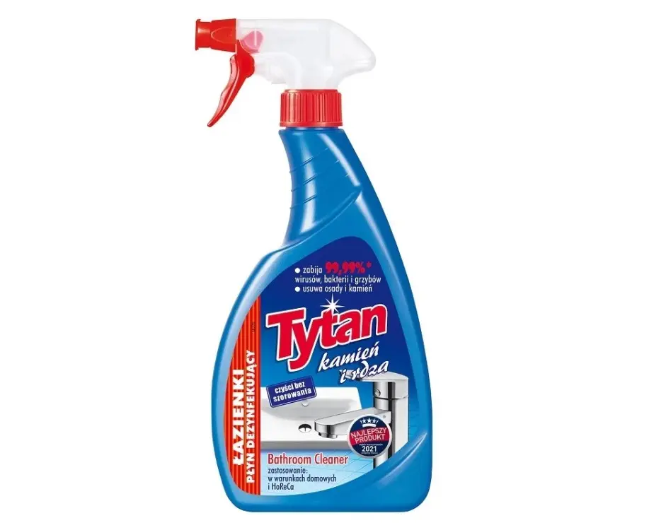 Bath and shower cleaning spray Tytan effectively removes scales, rust, soap scum, water spots, grease spots and other dirt. Designed for cleaning chrome, stainless steel (kitchen sinks), tiles, bathtubs, glass, plastic (shower cabins) and other surfaces. Removes plaque without excessive effort and restores the original appearance.