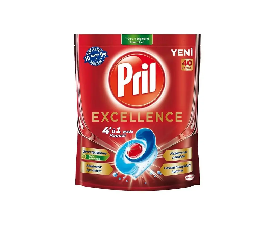 Pril Excellence 4-1 Arada Dishwasher Capsules Pack. It contains 40 capsules, each designed to provide a deep clean, excellent shine and protection for your dishwasher and delicate dishes. The capsules are designed to work efficiently even at low temperatures, ensuring sparkling clean dishes every time.