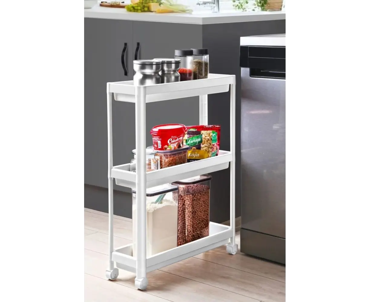 The shelf is ideal for both kitchen and bathroom use. Its compact and practical design ensures maximum use of space. Made from durable plastic, it is suitable for storing everyday items. The white color blends easily with various interior styles.