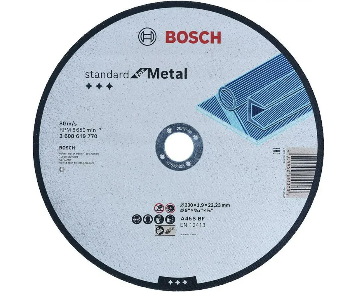The Bosch 2608619770 cutting disc is a professional-grade tool designed for efficient and precise cutting of metal. With a 230 mm diameter and a 22.23 mm bore, it fits most standard angle grinders. Its 1.9 mm thin profile ensures fast, smooth cuts with minimal material loss, while the durable construction guarantees a long service life even under intensive use. Operating at a maximum speed of 6650 RPM, this disc provides stable performance, clean edges, and high productivity — making it an ideal choice for both workshop and on-site applications.