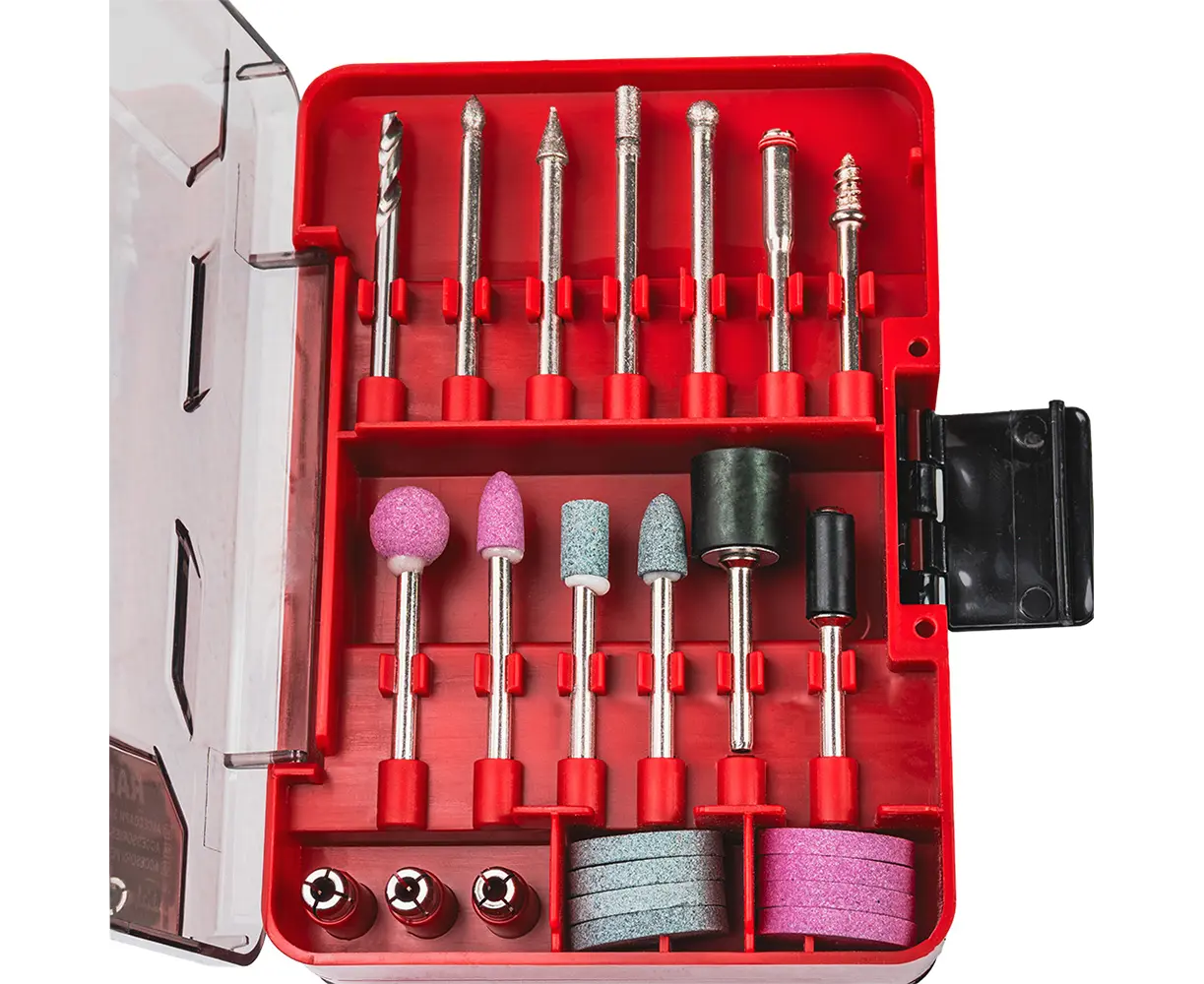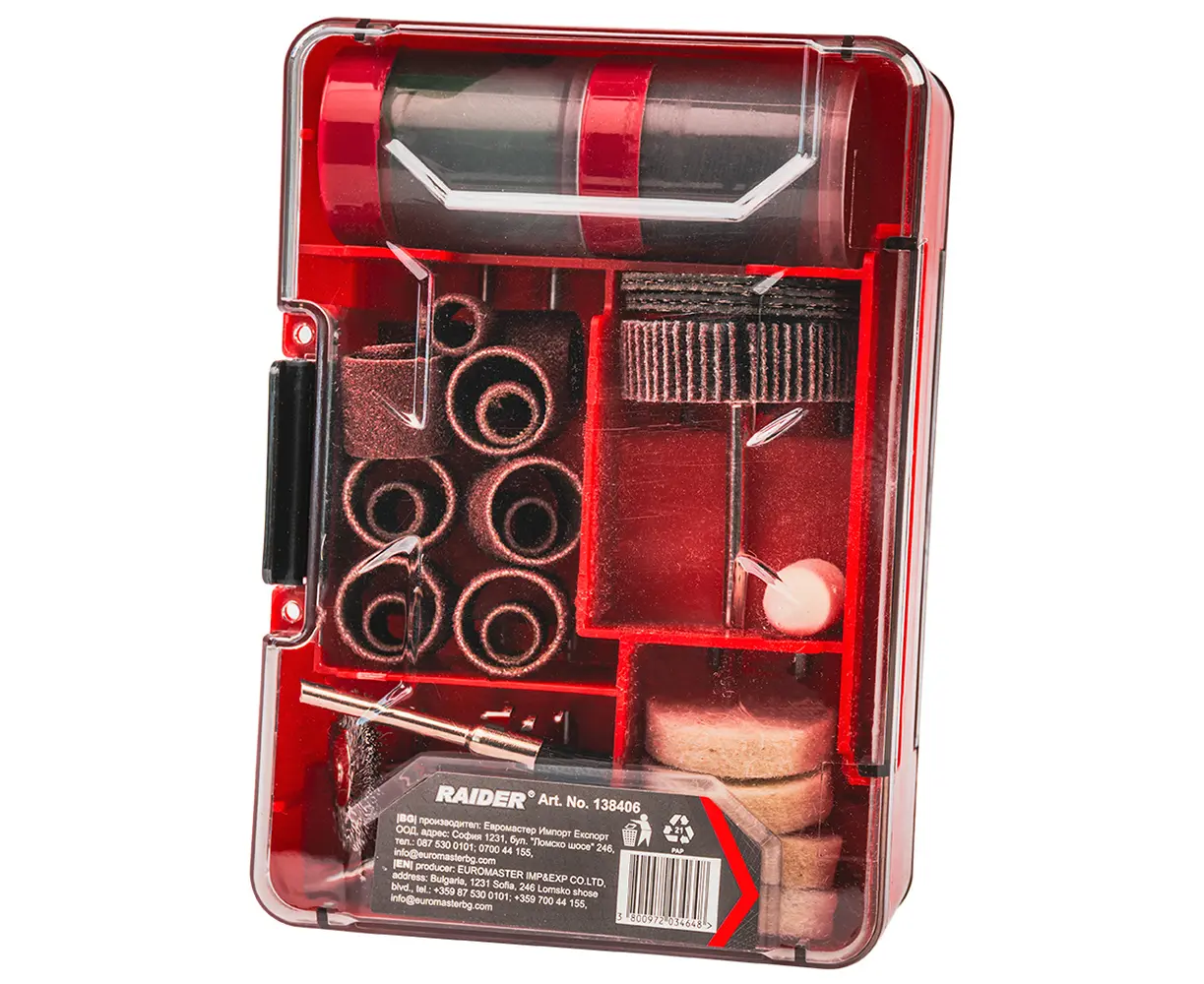 The Raider 138406 accessory set (96 pcs) is designed for precision tasks like sanding, polishing, grinding, engraving, and drilling. Compatible with most micro rotary tools, it comes in a compact red case for easy storage and portability.