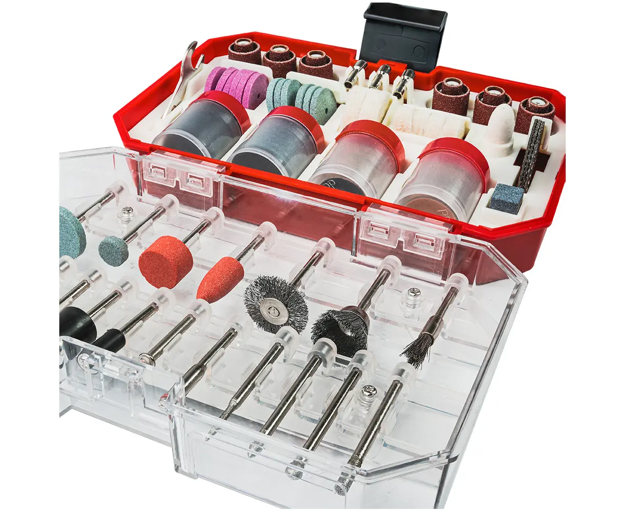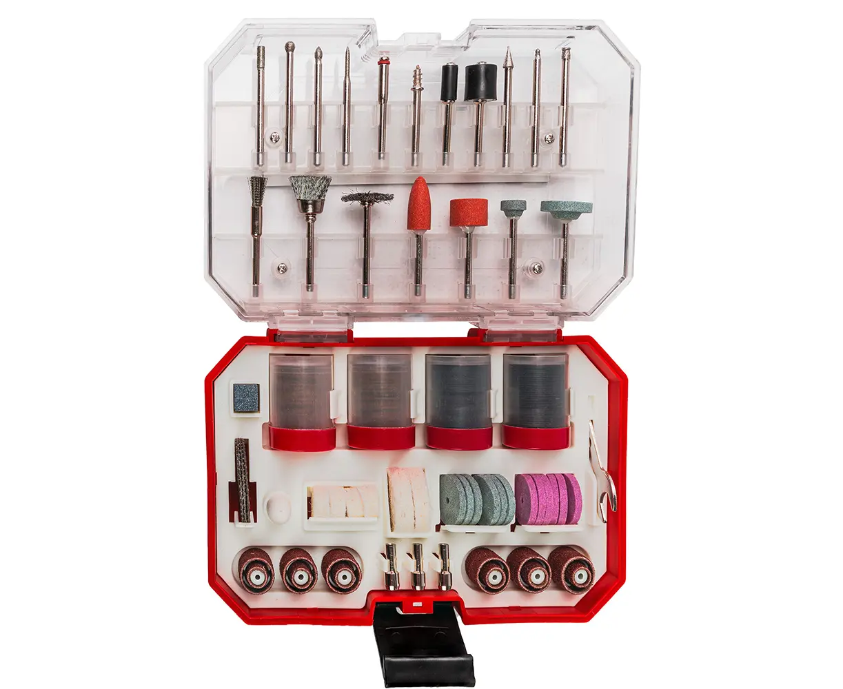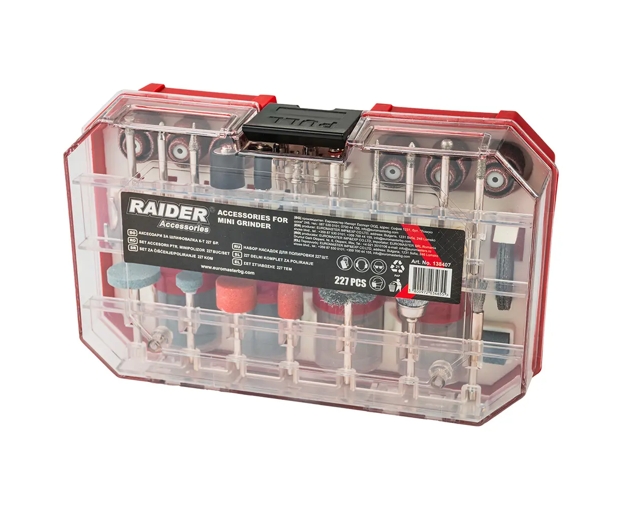 The Raider 138407 micro tool kit (227 pcs) offers a comprehensive range of accessories for cutting, grinding, engraving, polishing, and cleaning. It includes abrasive stones, engraving blades, cutting discs for various materials, polishing wheels, wire brushes, and grinding belts. Packed in a practical red case for easy access and storage.