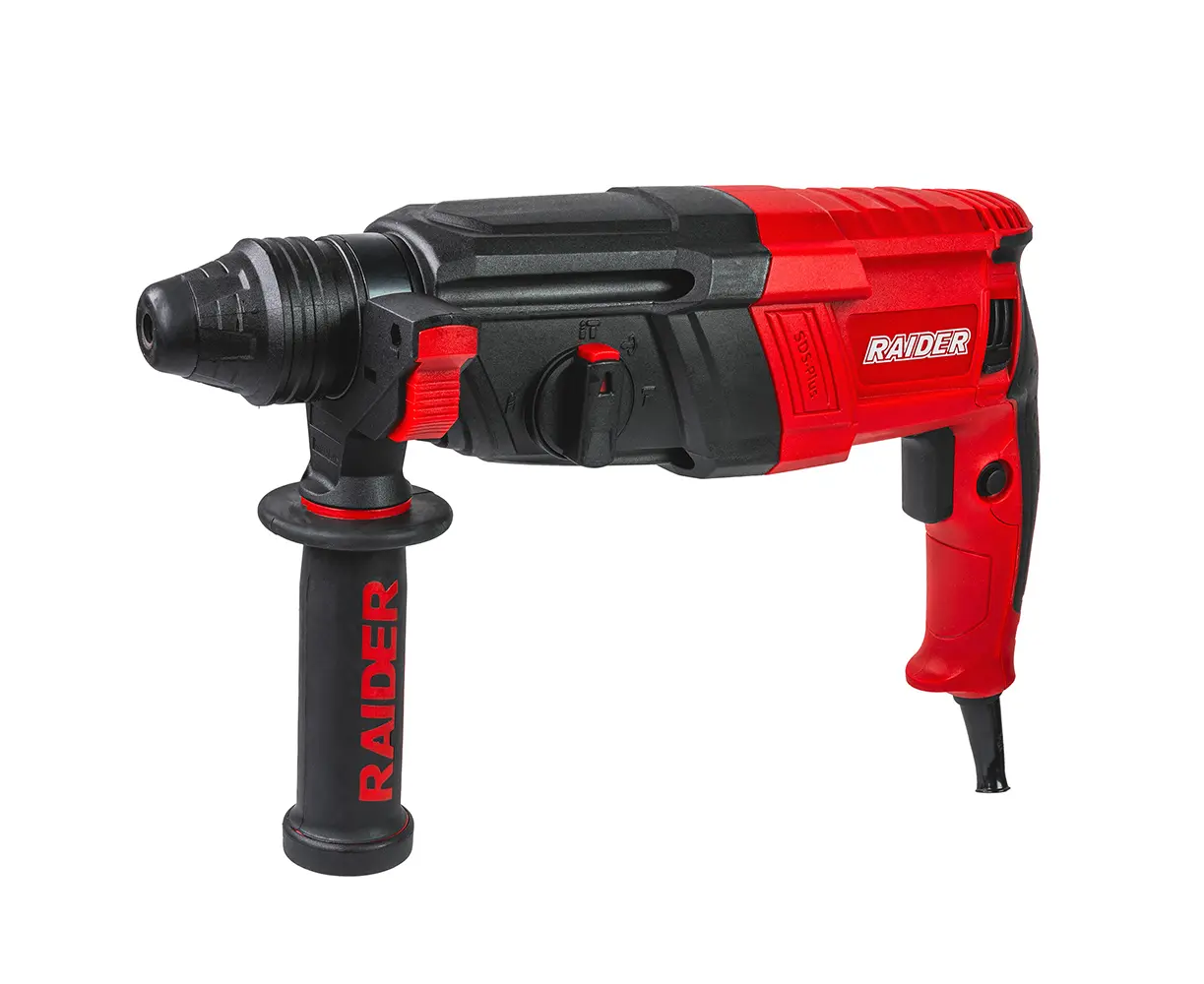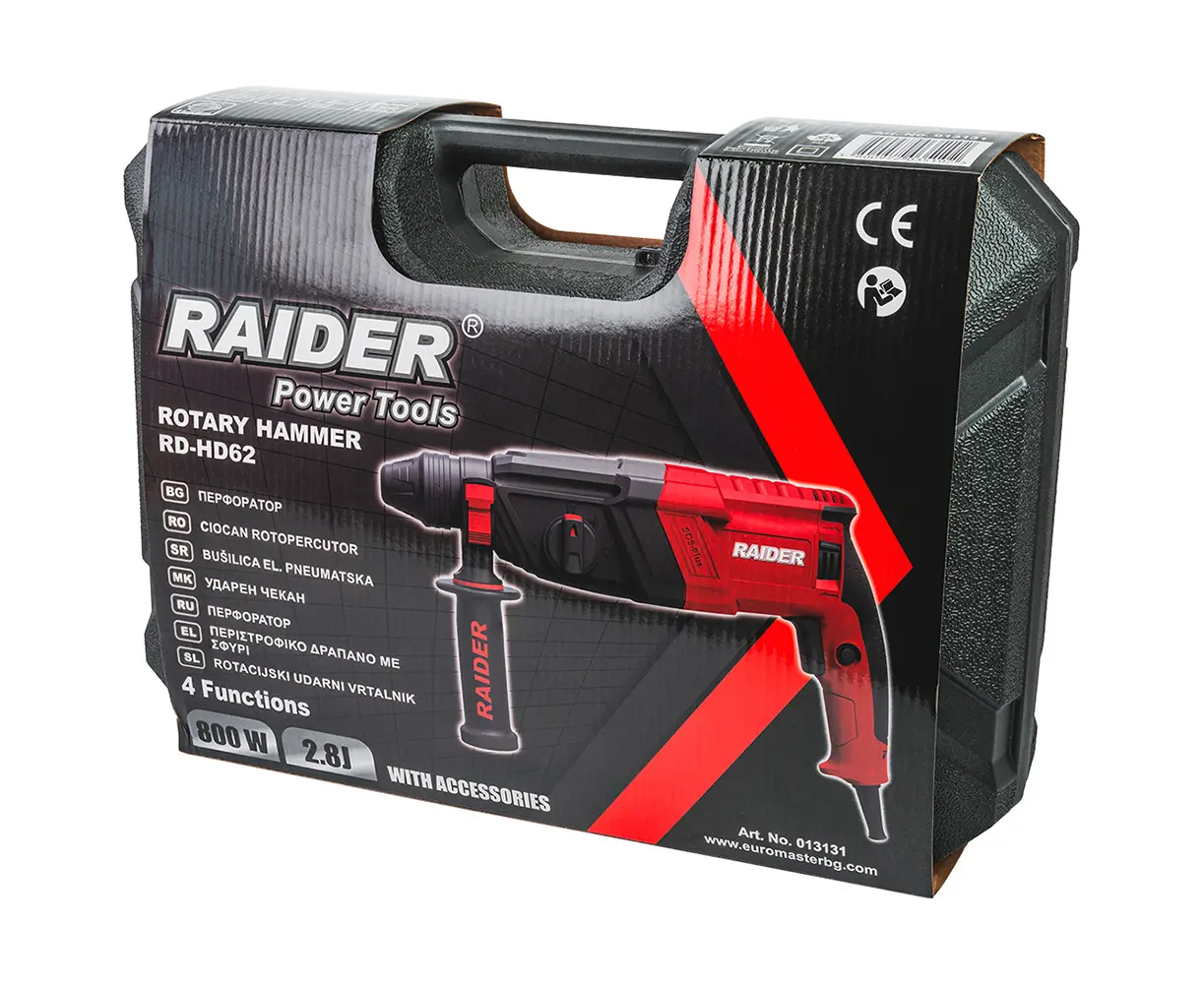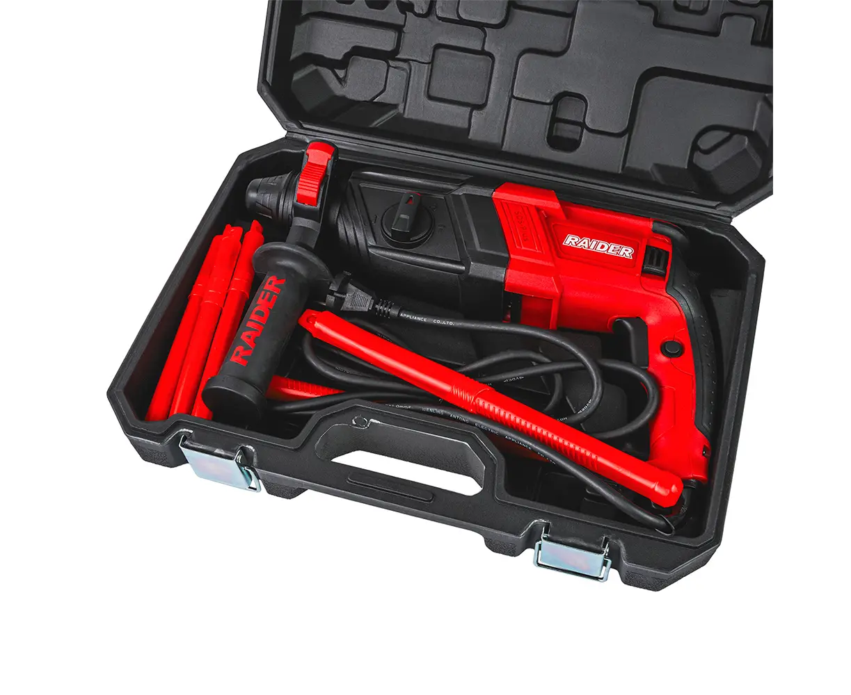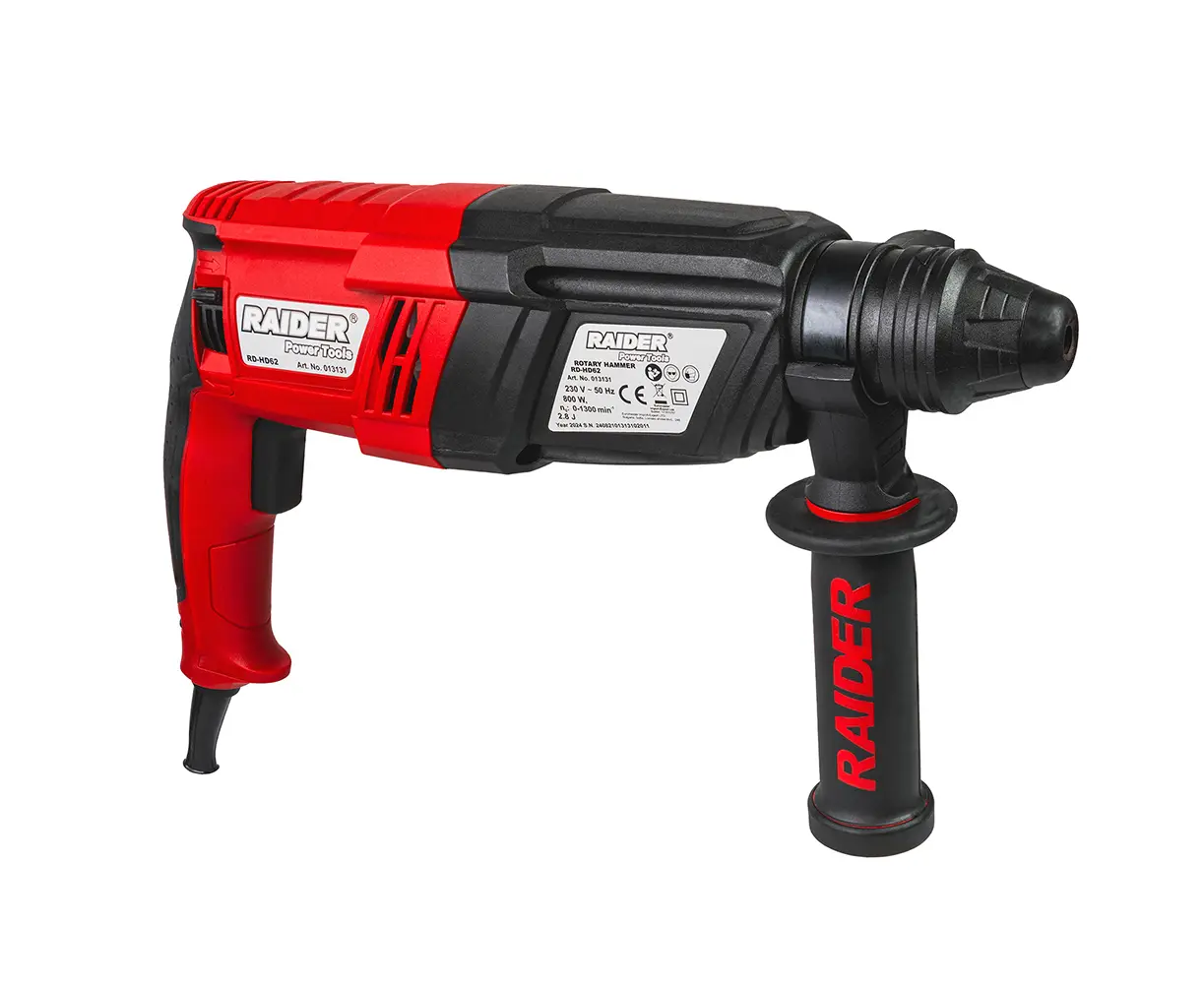 The Raider RD-HD62 Hammer Drill (800 W) delivers powerful 2.8 J impact force and operates at speeds up to 1300 rpm, making it ideal for concrete, metal, and wood. Equipped with 4 working modes—including chiseling—and reverse and variable speed control. Designed with a charcoal motor and powered by a 220 V mains supply, it drills up to 26 mm in concrete, 13 mm in metal, and 30 mm in wood. Comes in a durable red housing for demanding tasks. The RAIDER RD-HD62 electric rotary hammer is a powerful and versatile tool designed for both professional and DIY users who value high performance and precision in various tasks. Featuring four operating modes – chiseling, drilling, hammer drilling, and screwdriving – it is ideally suited for a wide range of construction and repair work. This model combines high efficiency with ease of use. The powerful 800W motor and 2.8 J impact energy allow the tool to easily handle drilling into concrete, masonry, wood, and metal. The SDS-Plus chuck ensures quick and convenient bit and chisel changes without the need for additional tools. The rotary hammer is equipped with ergonomic main and auxiliary handles, which guarantee a secure grip and reduce vibration during operation. For convenient storage and transportation, the tool comes in a durable plastic case. This multi-functional rotary hammer is an excellent choice for those seeking a reliable, durable, and affordable tool for drilling and chiseling.