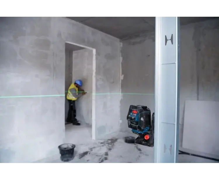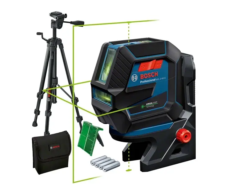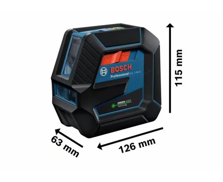 Rugged construction with rubberized housing and protection against dust and water. Updated ON/OFF switch and only one function button. Green horizontal and vertical beams for better visibility in bright environments.