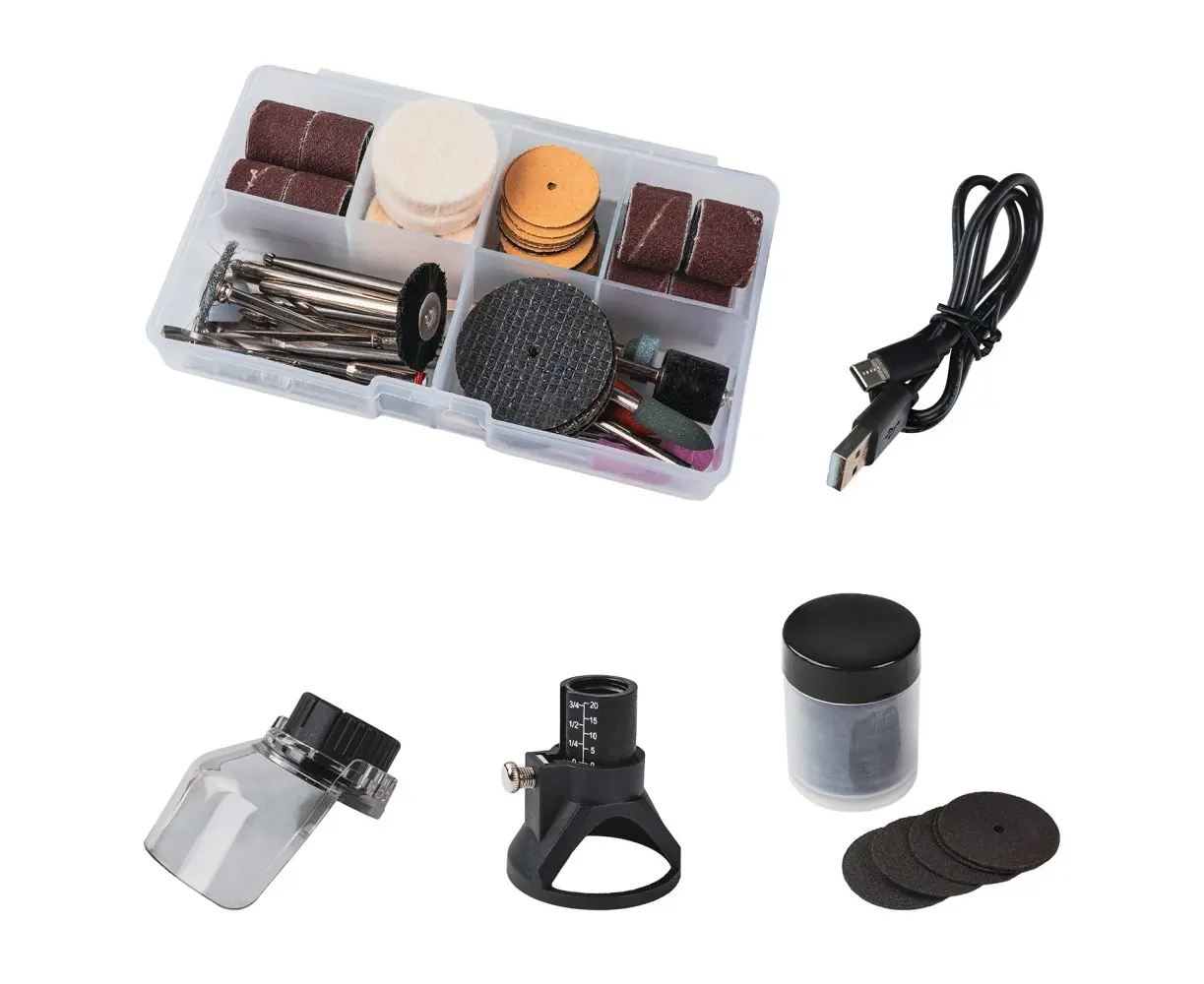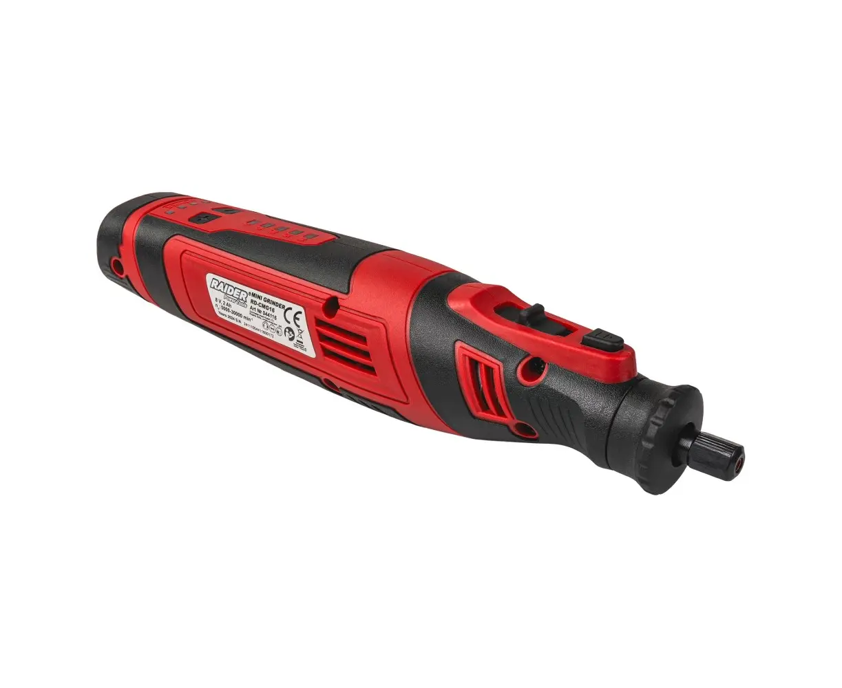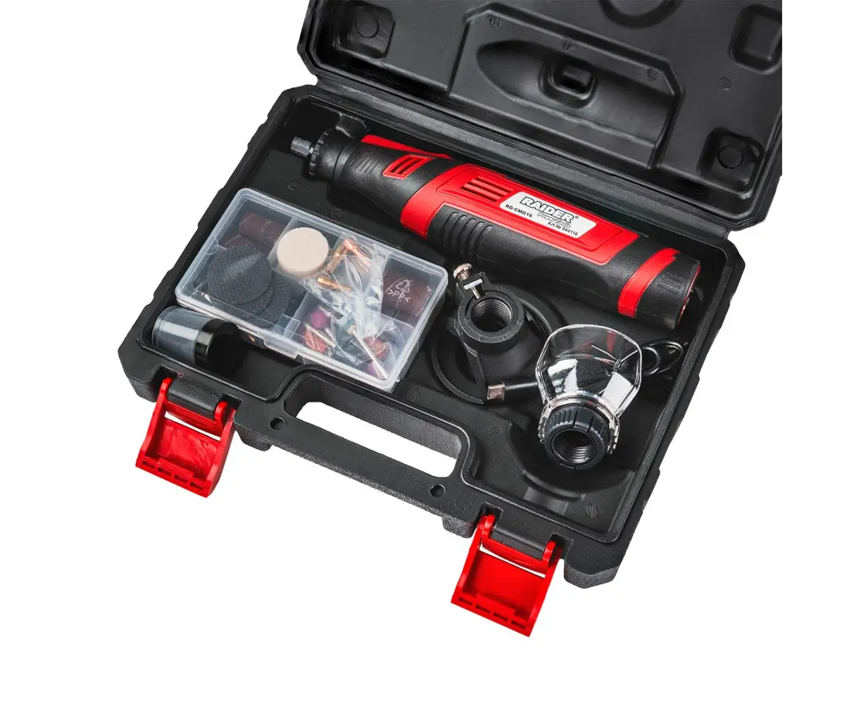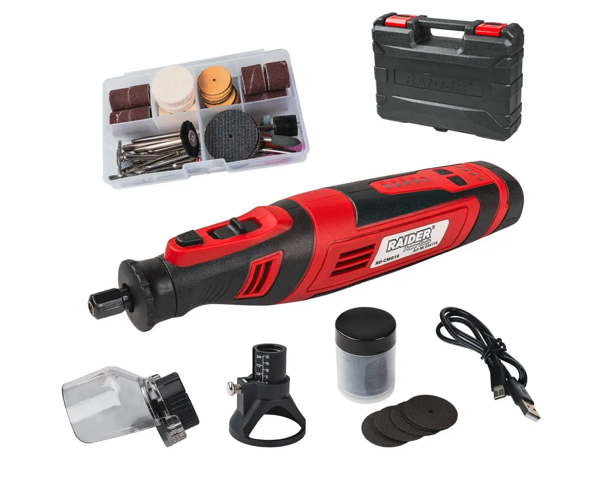 The Raider RD-CMG16 mini battery engraver (8V) features an adjustable no-load speed from 0 to 30,000 rpm, making it perfect for engraving, polishing, and fine detailing. Equipped with a 3.2 mm collet and 127 accessories, it offers versatility and precision for creative tasks. Compact and cordless for convenient use anywhere. The RAIDER RD-CMG16 cordless straight grinder is an excellent tool for performing fine processing and finishing of various materials. It is designed for a wide range of applications, including grinding, cutting, engraving, polishing, drilling, and precision fitting of diverse surfaces. The tool is powered by an 8V 2Ah battery, which ensures a long operating time without interruption. A key feature of the grinder is its variable speed control, allowing for precise adjustment of the tool to the characteristics of the material being processed and achieving impeccable results. Thanks to its light weight of 1.40 kg and ergonomic design, this grinder is optimized for prolonged use without causing discomfort. The absence of cords makes it an ideal solution for working in areas with limited access to electricity, such as gardens, construction sites, and workshops, providing freedom of movement and convenience. The battery is charged via a universal USB Type-C port. The delivery package includes an impressive set of 127 different accessories, covering almost all possible usage scenarios. All components of the set are neatly placed in a convenient plastic case. This compact and powerful mini-grinder will become an indispensable assistant in any workshop, combining high performance, precision, and exceptional ease of use.