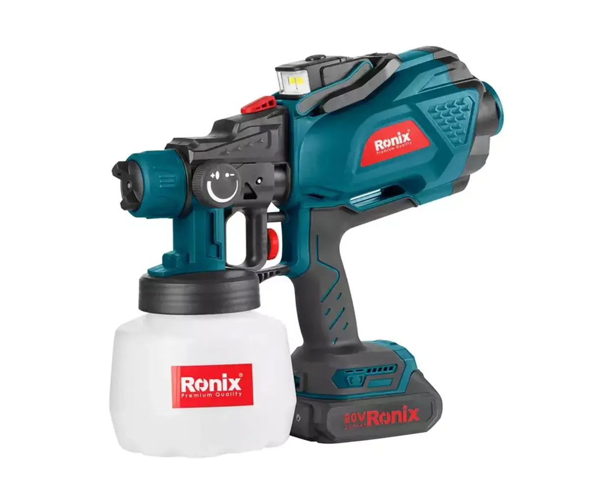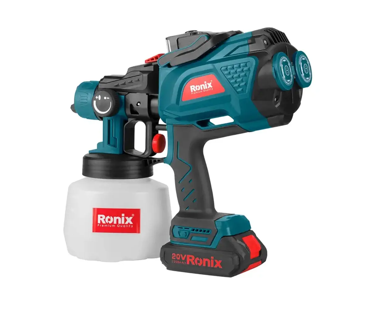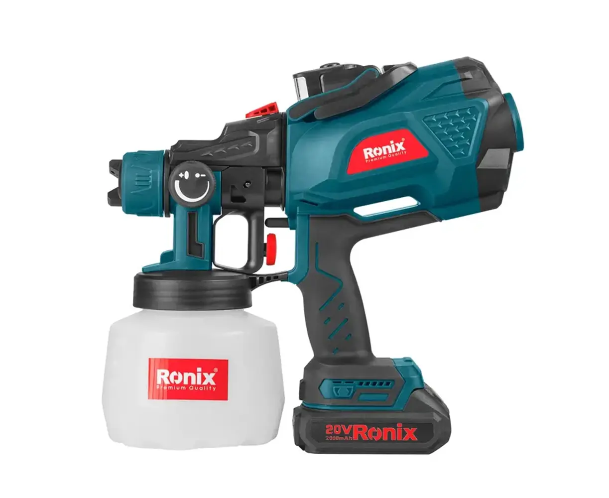 A multi-directional spray gun that can paint vertically, horizontally, and in round modes with its adjustable nozzle settings. Being cordless is one of the most prominent features of this spray gun, as it can cover a large surface area. The Ronix 20V Lithium-ion battery can work up to 18 - 20 minutes with a battery capacity of 2000mAh and deliver a maximum flow of 400ml/min. The battery is compatible with all Ronix all-in-one 86 series tools.