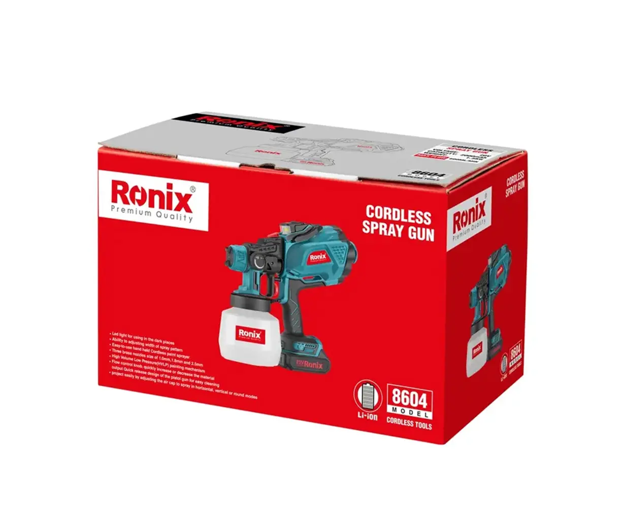 Next generation of HVLP Spray Guns! Ronix 8604 cordless spray guns are presented to the tools market to help users and DIYers get a smooth painting finish in no time. With its High-Volume Low Pressure (HVLP) mechanism, this cordless spray gun redefines performance like a pro.