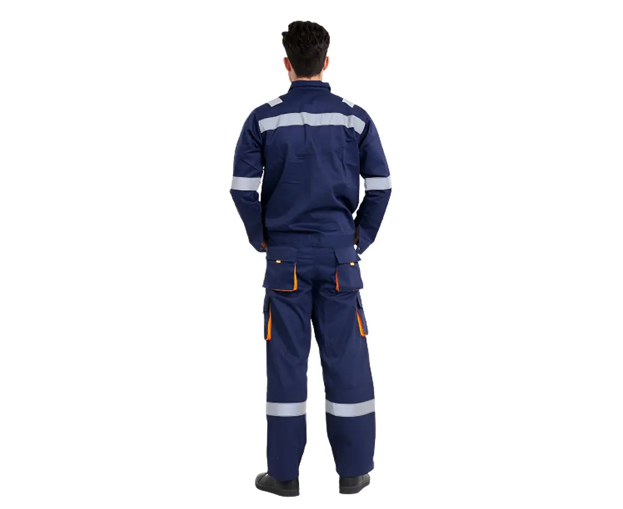 The model is blue with orange inserts at the top and bottom, fastens with a zipper covered with a flap with buttons. There are 5 cm thick reflective inserts at the top and bottom on the knees, arms and shoulders. The jacket and trousers are equipped with multifunctional and spacious pockets.