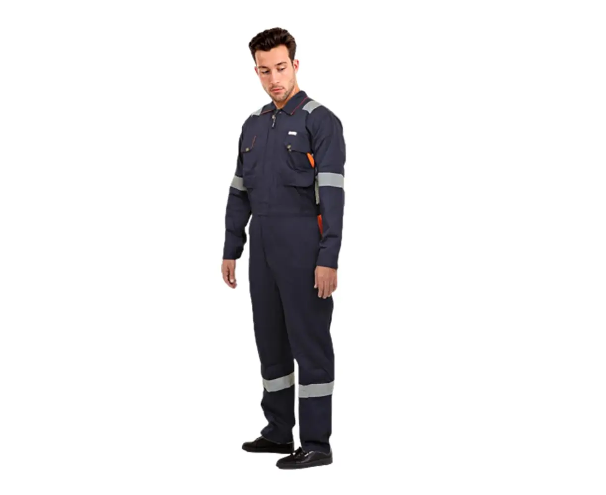Work overalls with 5 cm wide reflective tape on shoulders, arms and knees. The jumpsuit has 6 pockets and closes with a zipper.