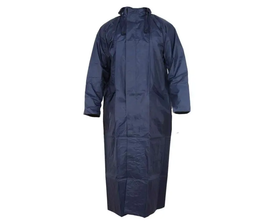 Rain jacket made of heat-sealed polyester. With zipper closure, flap hood with drawstring, waterproof pockets with flap.