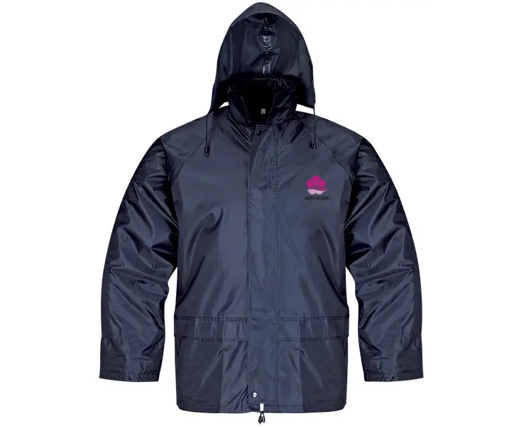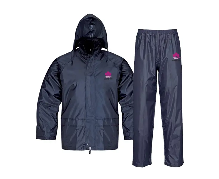 Rain jacket and pants made of heat-sealed polyester. With zipper closure, flap hood with drawstring, waterproof pockets with flap.