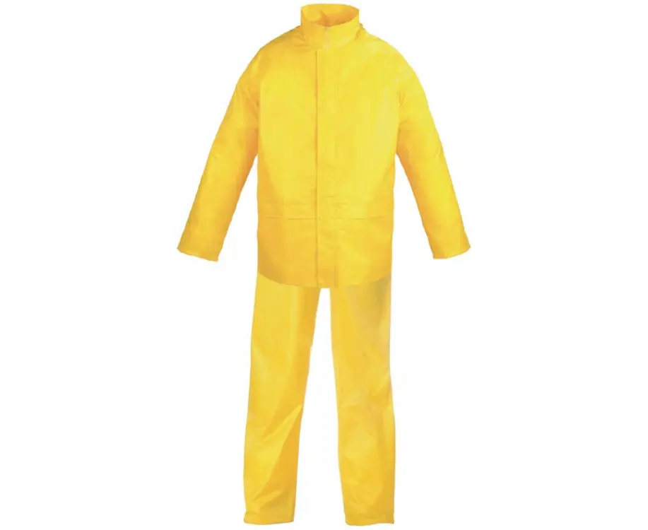 Rain jacket and pants made of heat-sealed polyester. With zipper closure, flap hood with drawstring, waterproof pockets with flap.