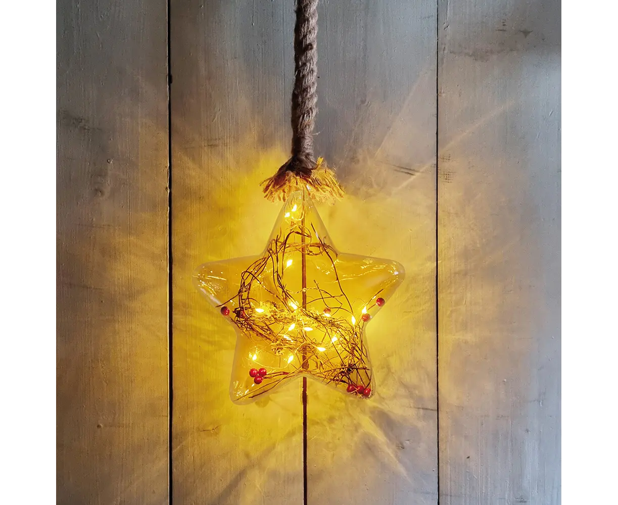 შექმენით ჯადოსნური ატმოსფერო თქვენს სახლში სადღესასწაულო LED ვარსკვლავით! იდეალურია თქვენი სახლის ან ბაღის გასაფორმებლად. ნათელი და ელეგანტური დეკორატიული ელემენტი შექმნის კომფორტისა და სითბოს ატმოსფეროს. დაე, ვარსკვლავი გახდეს სიხარულისა და მაგიის სიმბოლო თქვენს დღესასწაულზე. უწყვეტად ანათებს 6 საათის განმავლობაში. შევსებულია დეკორატიული ტოტებით, მოფენილია პატარა წითელი კენკრა. ვარსკვლავის არის პატარა თბილ-თეთრი LED ნათურები, რომლებიც ქმნიან თბილ და მიმზიდველ ბზინვარებას. პროდუქტი ხელმისაწვდომია ორ სხვადასხვა დიზაინში.