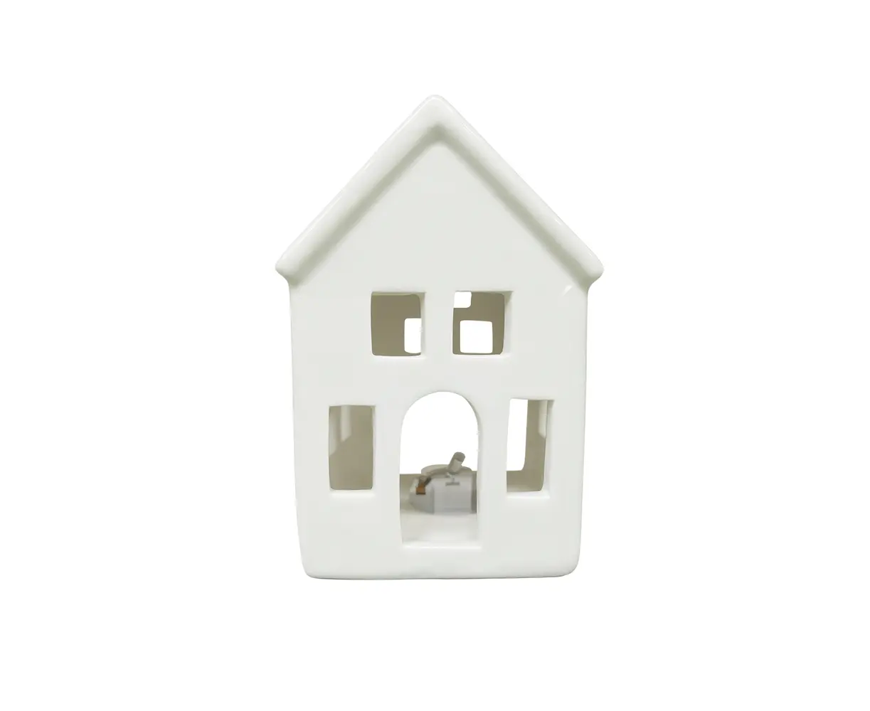 კერამიკის დეკორატიული სახლი დამონტაჟებული შიდა განათებით ქმნის თბილ, მყუდრო და სადღესასწაულო ატმოსფეროს. იდეალურია თაროსთვის, ბუხრის ზედაპირზე ან როგორც დამოუკიდებელი დეკორატიული ელემენტი. ასევე, შესანიშნავი არჩევანია საახალწლო სუფრის, მისაღების და საოფისე სივრცის გასალამაზებლად.