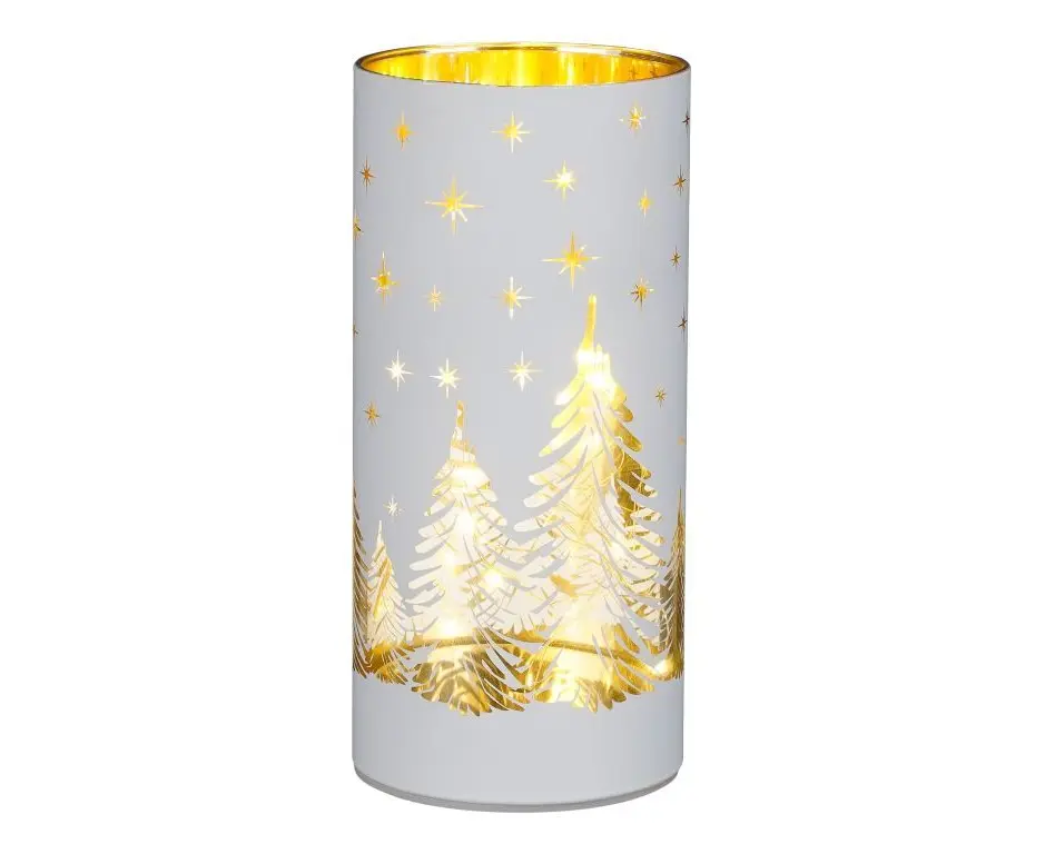 მომხიბლავი დეკორაცია, ოქროს ნაძვის ხეებისა და ვარსკვლავების დიზაინით, ანიჭებს თბილ და მიმზიდველ ბზინვარებას, იდეალურია ნებისმიერი სივრცისთვის სადღესასწაულო განწყობის შესაქმნელად.