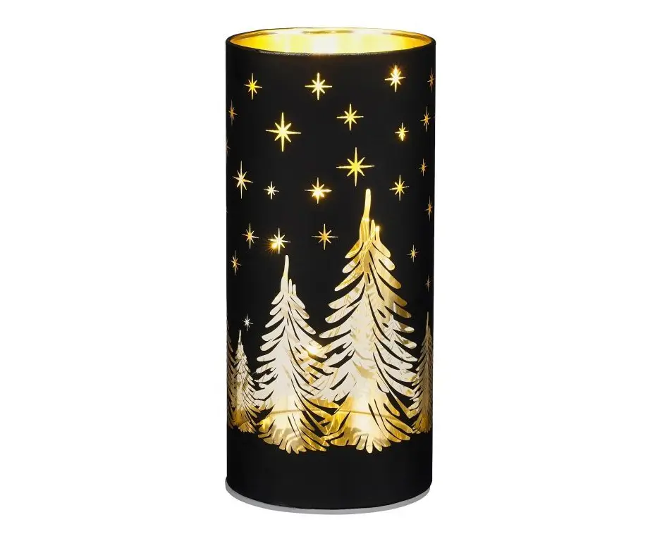 მომხიბლავი შავი დეკორაცია, ოქროს ნაძვის ხეებისა და ვარსკვლავების დიზაინით, ანიჭებს თბილ და მიმზიდველ ბზინვარებას, იდეალურია ნებისმიერი სივრცისთვის სადღესასწაულო განწყობის შესაქმნელად.