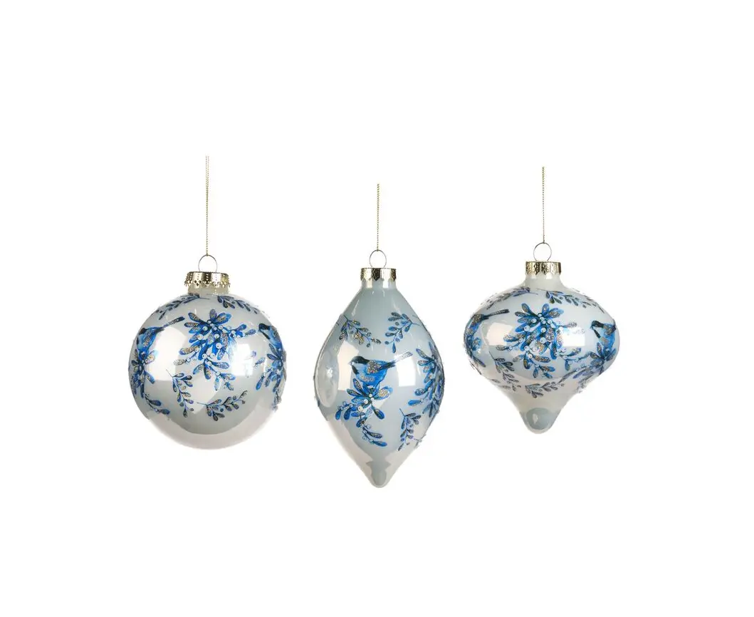 მორთულობა საახალწლო შუშის ბურთი GLSS DELFT BIRD BALL FIN ORN ASS 3 WH BLU 10სმ