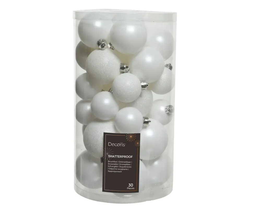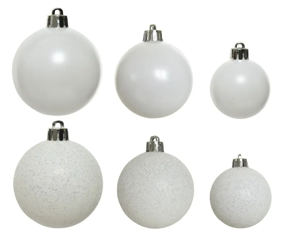 თეთრი ნაძვის ხის ბურთების ეს კომპლექტი შექმნილია სადღესასწაულო დეკორის ერთიანი, ელეგანტური და ნათელი სტილისთვის. სინათლისა და მბზინავი ეფექტების შეხამება ბურთებს მრავალფეროვან ტექსტურას აძლევს და საშუალებას იძლევა, რომ ნაძვის ხე უფრო მოცულობითი და თვალში საცემი გახდეს. კომპლექტში სხვადასხვა ზომისა და ზედაპირის (მქრქალი, მბზინავი, გლიტერიანი) ბურთებია, რაც დეკორირებას უფრო მრავალფეროვანსა და დამუშავებულს ხდის. ბურთები დამზადებულია მსუბუქი, უვნებელი და დაუმსხვრეველი მასალისგან, რაც მათ უსაფრთხოს და მრავალჯერადი გამოყენებისთვის უპირატესს ქმნის.