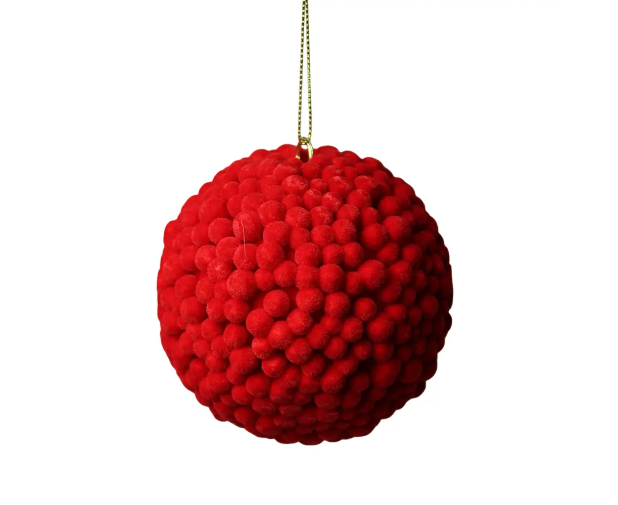 ნაძვის ხის სათამაშო ბურთი დუნელი პომპონების ტექსტურით – განათებული და მქრქალი ზედაპირი განსაკუთრებულ სითბოსა და მყუდროობას მატებს საახალწლო დეკორს. რბილი, ფუმფულა ელემენტები ბურთს უნიკალურ იერს აძლევს და იდეალურად ერწყმის როგორც კლასიკურ, ისე თანამედროვე სტილს. მარტივად ეკიდება ნაძვის ხის ტოტებზე და ქმნის თვალშისაცემ წითელ აქცენტს.