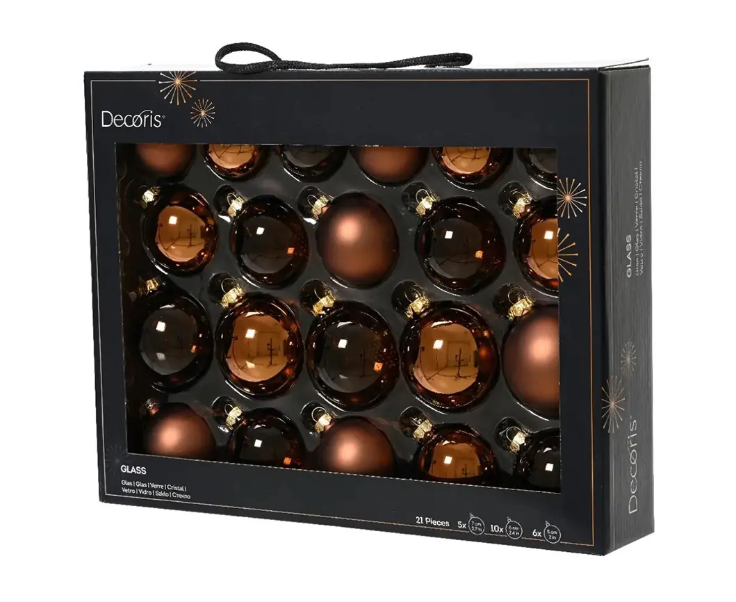 დახვეწილი და მყუდრო ატმოსფეროს შესაქმნელად Decoris-ის მინის ბურთების ნაკრები შეუცვლელი ელემენტია თქვენი ნაძვის ხის დეკორაციაში. ყავისფერი და ბრინჯაოსფერი ტონების ჰარმონიული შერწყმა ქმნის თბილ, ნატურალურ და ელეგანტურ ფერთა გამას, რომელიც იდეალურად ერგება როგორც კლასიკურ, ისე თანამედროვე სტილს.