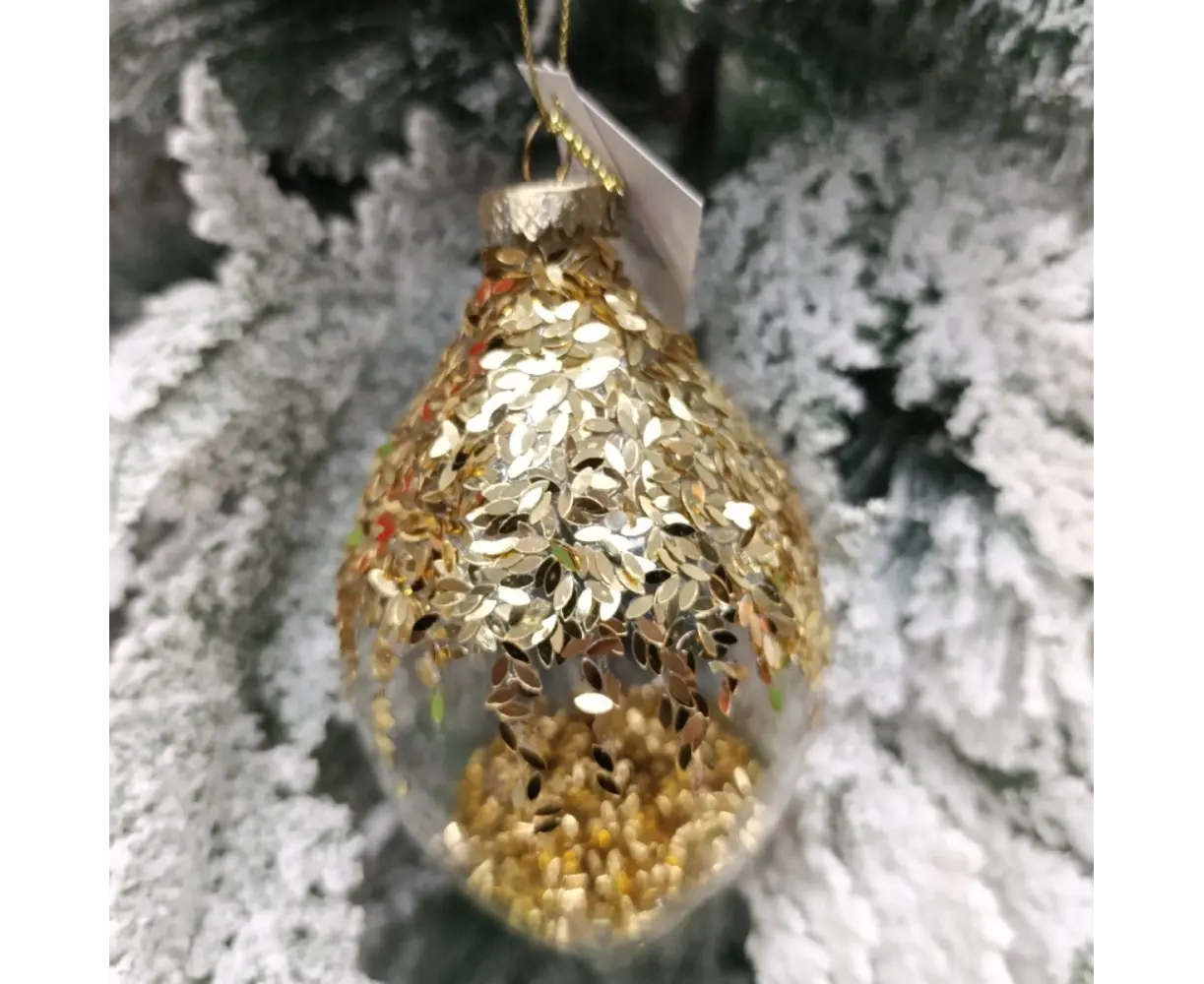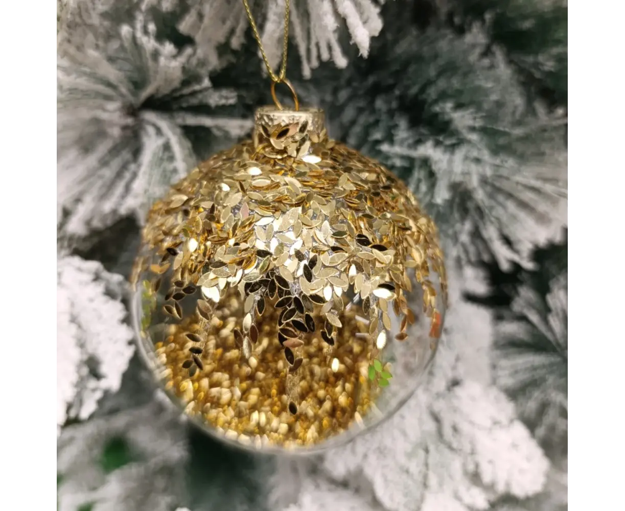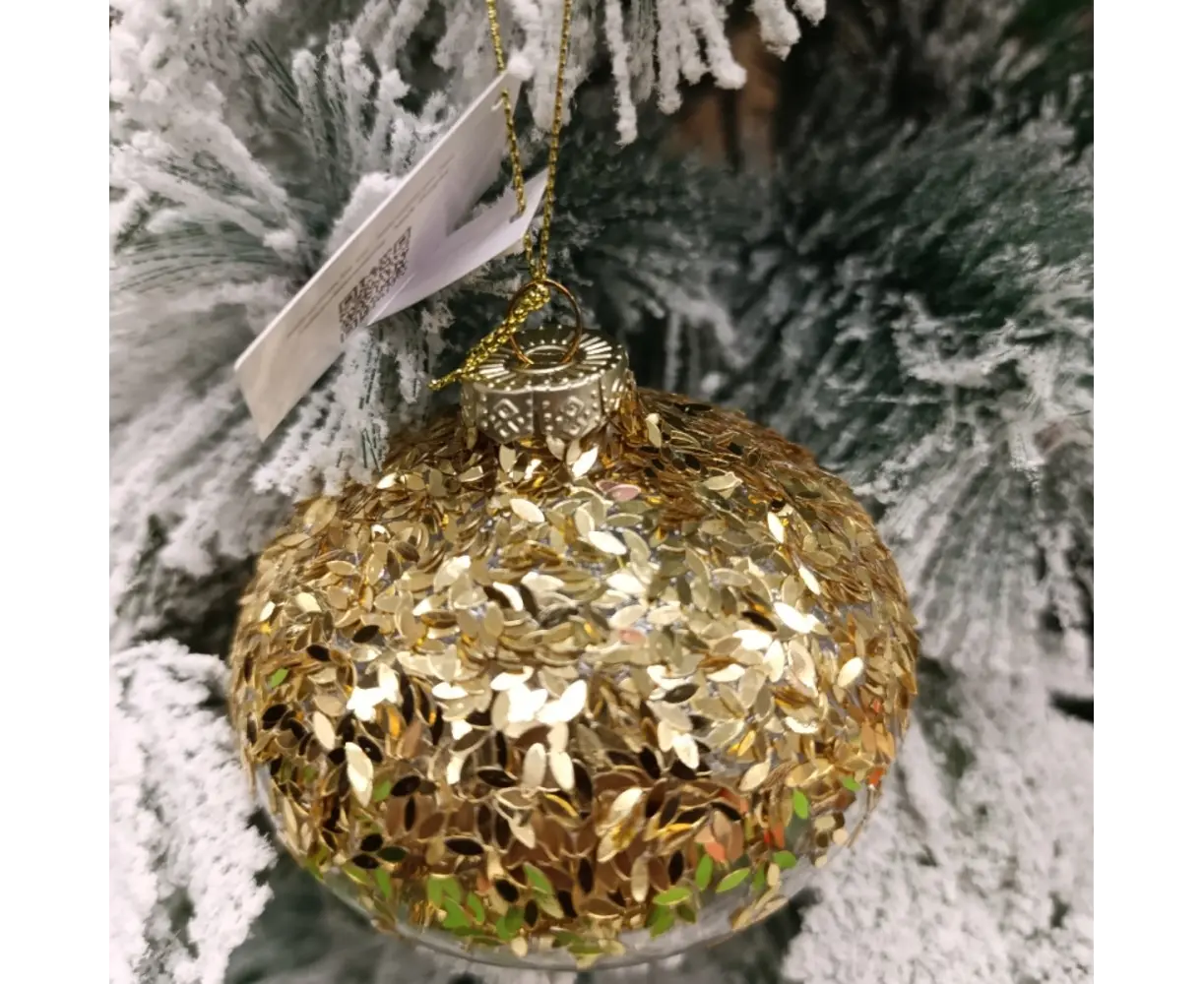 ნაძვის ხის სათამაშო ბურთი ოქროსფერი ფოთლების დეკორით ქმნის ბრწყინვალე და ელეგანტურ შთაბეჭდილებას. გამჭვირვალე ზედაპირის შიგნიდან გაფორმებული მბზინავი ოქროსფერი ელემენტები საოცრად ირეკლავს სინათლეს და ავსებს სივრცეს თბილი, დღესასწაულური ნათებით. ბურთი იდეალურად ერწყმის როგორც კლასიკურ, ისე თანამედროვე დეკორ სტილს და ნაძვის ხეს ან დეკორატიულ კომპოზიციას აძლევს მდიდრულ იერსა და სიმშვენიერეს.