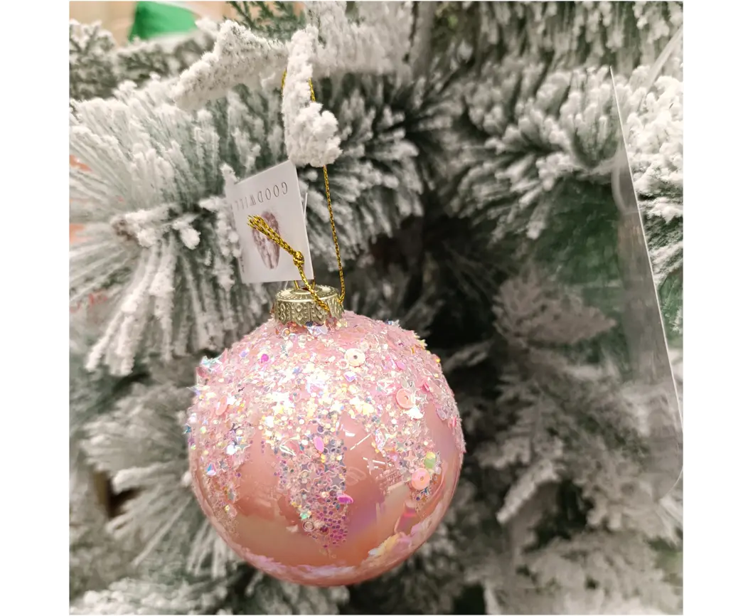მშვენიერი და ნაზი Goodwill-ის მინის ბურთი თქვენს ნაძვის ხეს ან ინტერიერს მიანიჭებს ელეგანტურობასა და ფანტაზიურ ბრწყინვალებას. ვარდისფერი ფონი, მბზინავი გლიტერისა და მარგალიტისფერი მარცვლების შერწყმა ქმნის ზღაპრულ იერს, რომელიც იდეალურად ერგება როგორც კლასიკურ, ისე რომანტიკულ საახალწლო დეკორს.