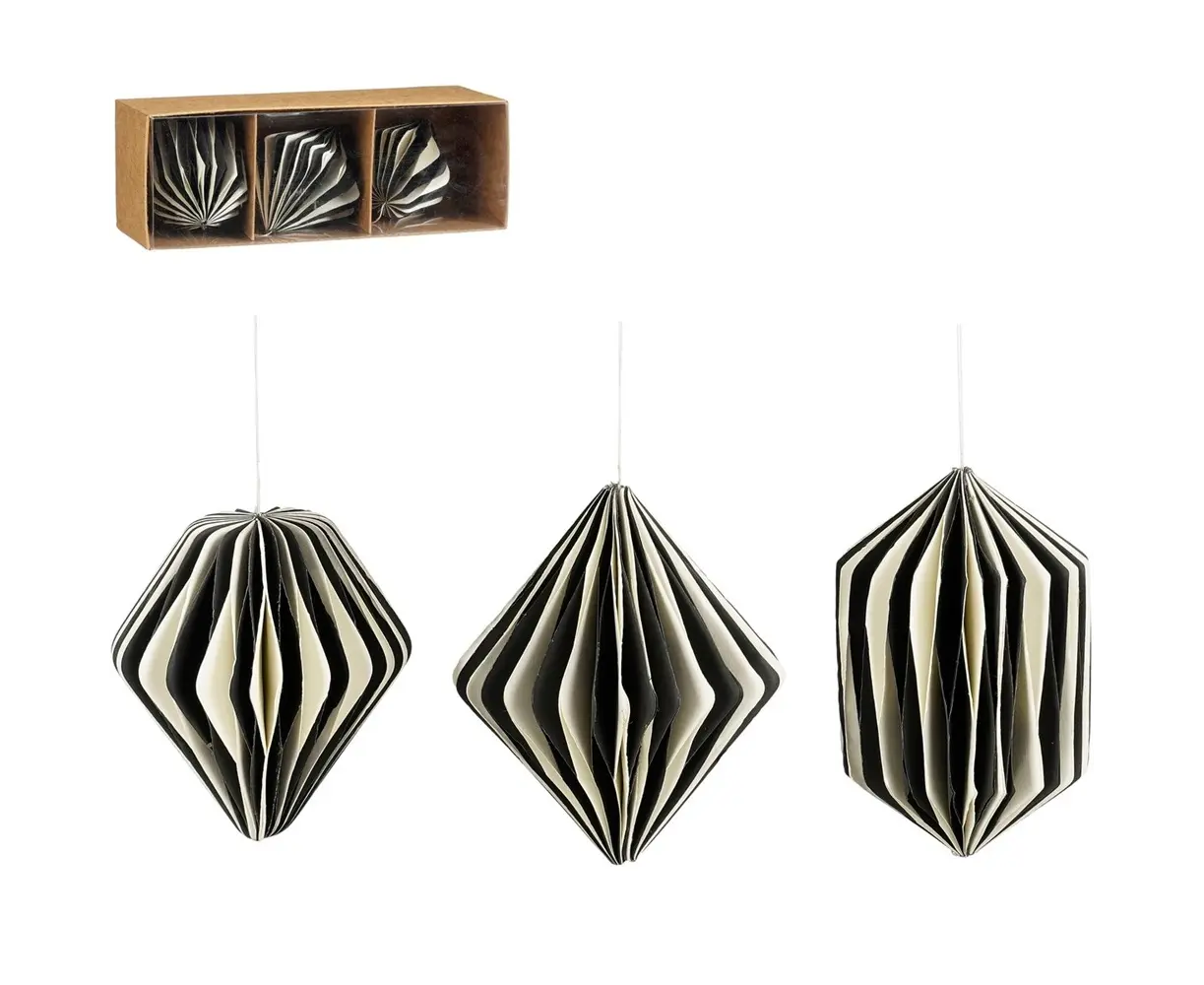 თანამედროვე დიზაინის ქაღალდის დეკორაციების ნაკრები. შავი და თეთრი ფერების კომბინაცია ქმნის მოდერნულ, გრაფიკულ ეფექტს, რომელიც მარტივად ერწყმის სხვადასხვა სტილის საშობაო დეკორს: მინიმალისტურს, სკანდინავიურს, კლასიკურსა თუ თანამედროვეს.