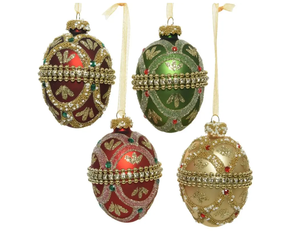 ნაძვის ხის სათამაშო კვერცხის ფორმით, გაფორმებული ოქროსფერი გლიტერითა და მძივებით. ბზინვარე და ელეგანტური დიზაინი ქმნის დღესასწაულის ატმოსფეროს და ამშვენებს ნაძვის ხეს.