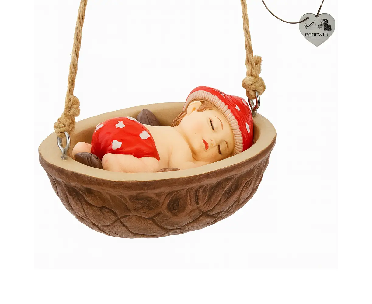 მინიატურული ორნამენტი " მძინარე ბავშვი სოკოს ქუდით, კაკლის ფორმის ბუდეში" წითელ და ყავისფერ ტონებში შესრულებული დიზაინი ქმნის თბილ, ზღაპრულ და მყუდრო განწყობას. მარტივად შეგიძლიათ მოათავსოთ ნაძვის ხეზე ან დეკორატიულ კომპოზიციებში.