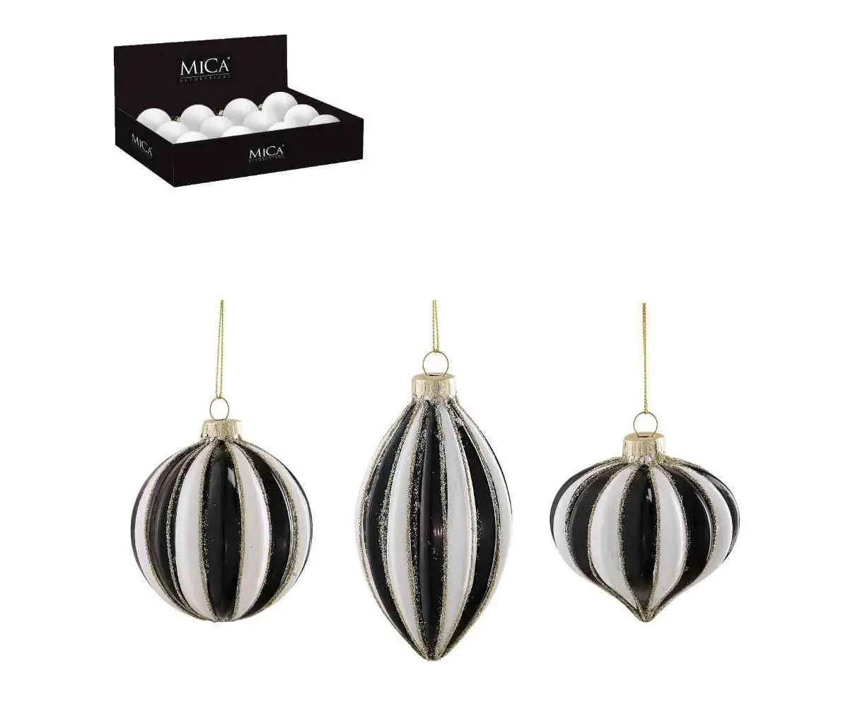 საახალწლო ნაძვის ხის სათამაშო წარმოდგენილია სამ განსხვავებულ ფორმაში. შავ-თეთრი ფერები ოქროსფერი მბზინავი დეტალებით, თითოეულ ორნამენტს განსაკუთრებულად მდიდრულ და დახვეწილ იერს აძლევს. იდეალურია ნაძვის ხის გაფორმებისთვის, კლასიკური და თანამედროვე სტილის ინტერიერებში.