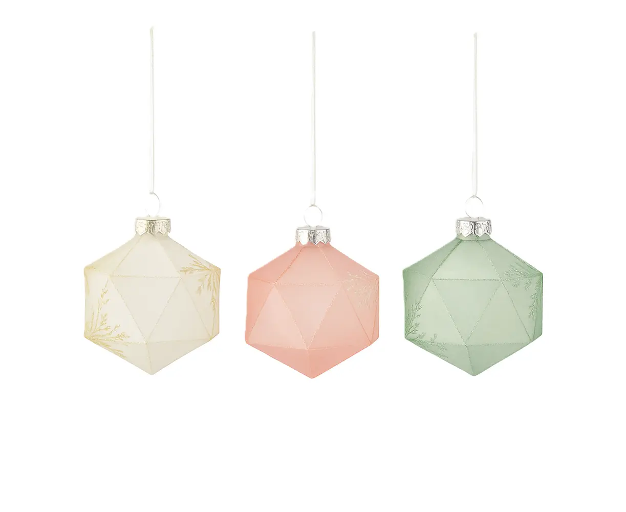 საახალწლო ნაძვის ხის სათამაშო წარმოდგენილია სამ განსხვავებულ ფერში. გეომეტრიული, კრისტალისებრი ფორმა და დელიკატური მბზინავი ორნამენტები დეკორს განსაკუთრებულად სადღესასწაულო იერს ანიჭებს. სათამაშოები მსუბუქია, გამძლე და იდეალურად ერგება როგორც ნაძვის ხეს, ასევე სხვა დაკიდებულ კომპოზიციებს.