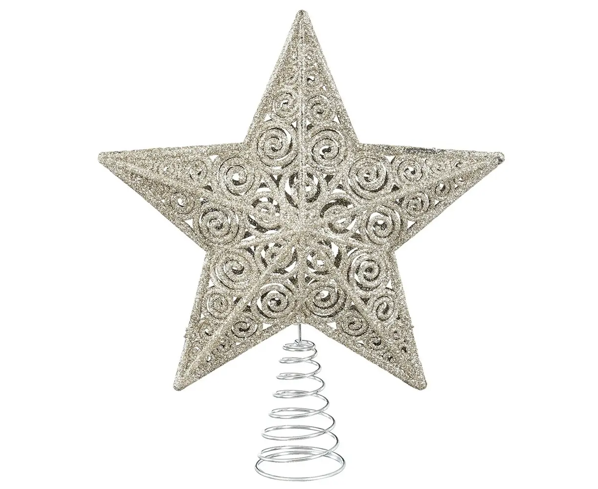 ვარსკვლავი ნაძვის ხის წვერისთვის, მბზინავი ზედაპირით და დახვეწილი ორნამენტული დიზაინით. მსუბუქი კონსტრუქცია და სპირალური დამჭერი უზრუნველყოფს მარტივ და უსაფრთხო დამაგრებას.